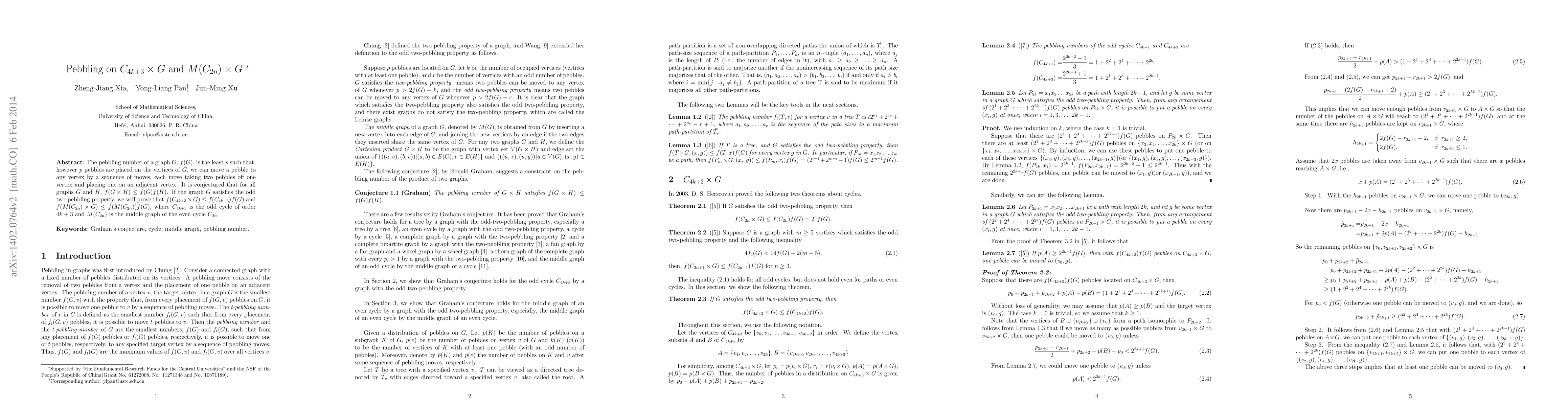 The pebbling number of a graph $G$, $f(G)$, is the least $p$ such that, however $p$ pebbles are placed on the vertices of $G$, we can move a pebble to any vertex by a sequence of moves, each move taking two pebbles off one vertex and placing one on an adjacent vertex. It is conjectured that for all graphs $G$ and $H$, $f(G\times H)\leq f(G)f(H)$. If the graph $G$ satisfies the odd two-pebbling property, we will prove that $f(C_{4k+3}\times G)\leq f(C_{4k+3})f(G)$ and $f(M(C_{2n})\times G)\leq f(M(C_{2n}))f(G)$, where $C_{4k+3}$ is the odd cycle of order $4k+3$ and $M(C_{2n})$ is the middle graph of the even cycle $C_{2n}$.