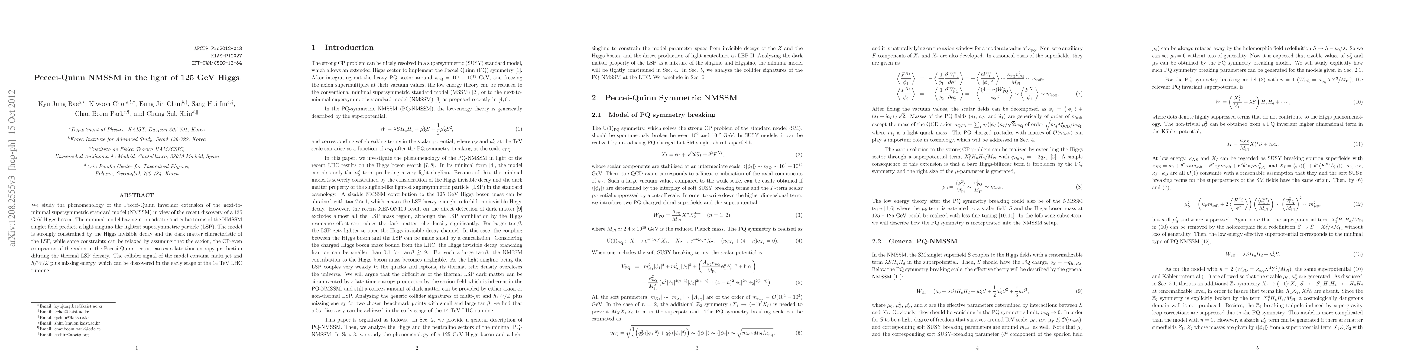 This paper examines the Peccei-Quinn invariant extension of the NMSSM in light of the 125 GeV Higgs boson, finding that the model predicts a light singlino-like LSP constrained by invisible Higgs decay and dark matter. The presence of the saxion may alleviate some constraints, and the model's collider signals include multi-jet and $h/W/Z$ plus missing energy, potentially observable at the early stages of the 14 TeV LHC.