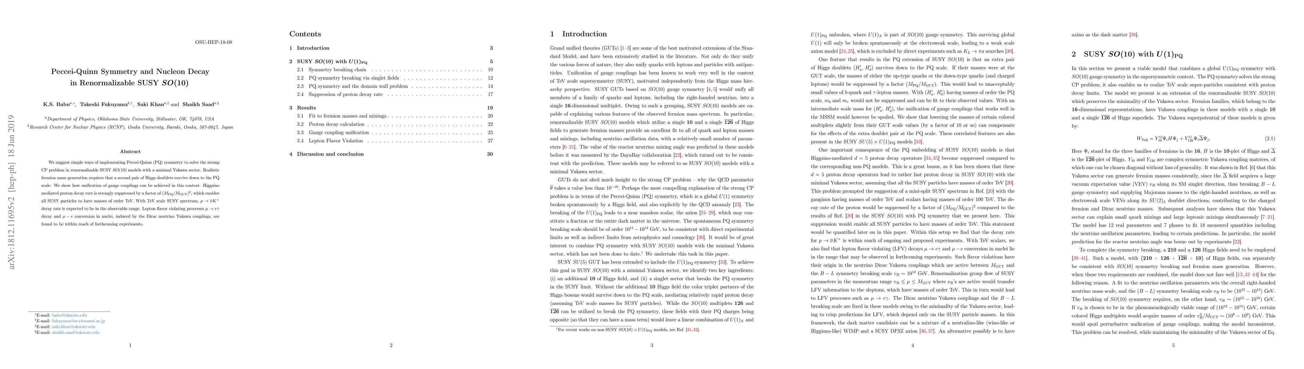 This paper proposes a method to incorporate Peccei-Quinn symmetry in renormalizable SUSY SO(10) models to resolve the strong CP problem, demonstrating how gauge coupling unification is possible with an additional Higgs doublet. It shows that nucleon decay rates are significantly suppressed, allowing for a TeV-scale SUSY spectrum where proton decay and lepton flavor violation processes are experimentally accessible.