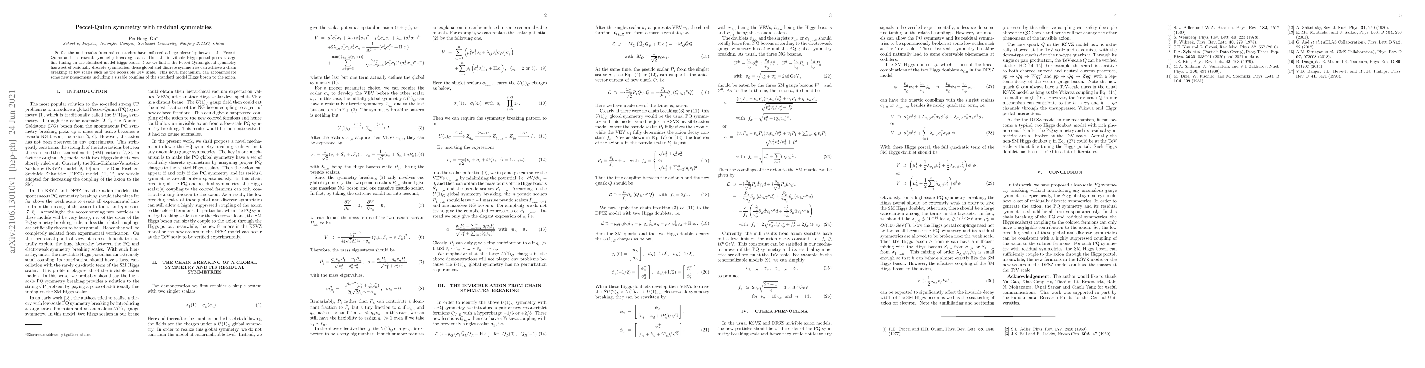 This paper explores how residual symmetries in Peccei-Quinn symmetry can break the hierarchy between the Peccei-Quinn and electroweak scales at the accessible TeV scale, potentially resolving the fine-tuning issue in the standard model Higgs scalar and enabling new phenomena such as a sizable coupling between the Higgs boson and the axion.