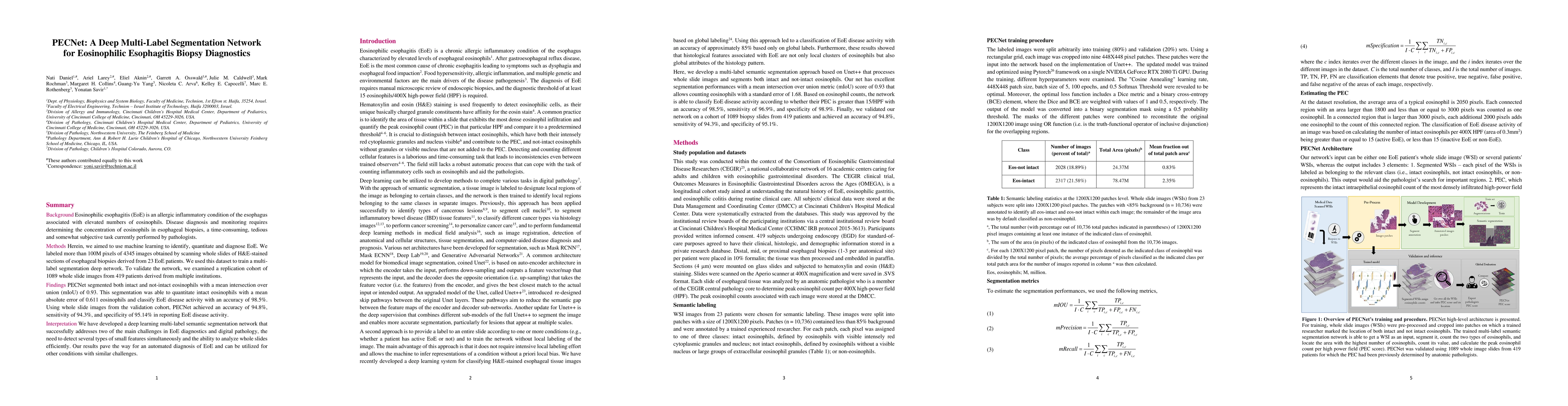 PECNet, a deep multi-label segmentation network, automates the diagnosis of eosinophilic esophagitis (EoE) by segmenting eosinophils in esophageal biopsy images, achieving high accuracy and efficiency. This approach reduces the burden on pathologists and holds promise for broader application in digital pathology.