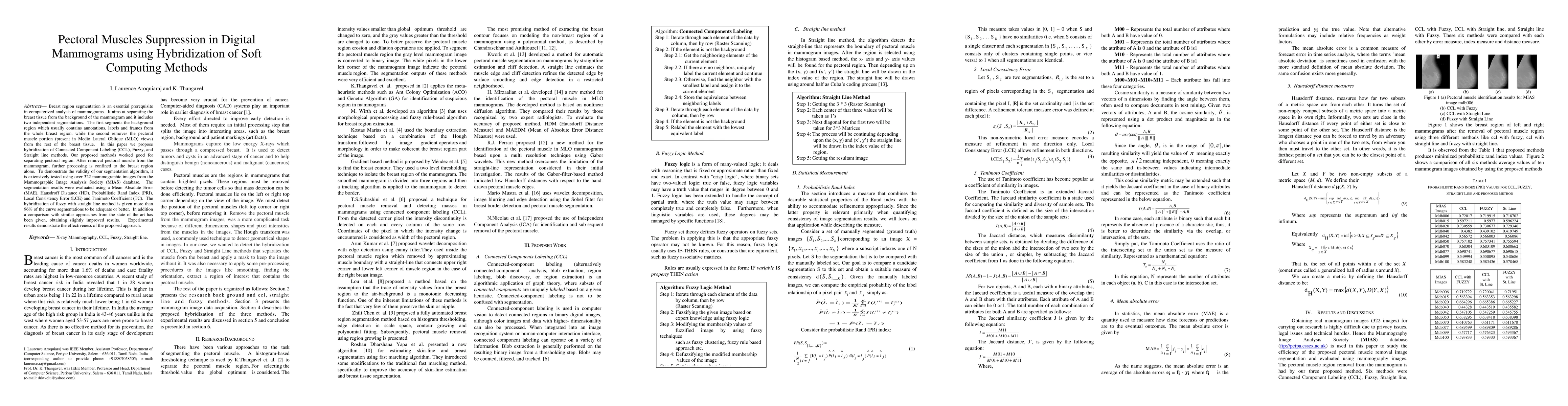 Breast region segmentation is an essential prerequisite in computerized analysis of mammograms. It aims at separating the breast tissue from the background of the mammogram and it includes two independent segmentations. The first segments the background region which usually contains annotations, labels and frames from the whole breast region, while the second removes the pectoral muscle portion (present in Medio Lateral Oblique (MLO) views) from the rest of the breast tissue. In this paper we propose hybridization of Connected Component Labeling (CCL), Fuzzy, and Straight line methods. Our proposed methods worked good for separating pectoral region. After removal pectoral muscle from the mammogram, further processing is confined to the breast region alone. To demonstrate the validity of our segmentation algorithm, it is extensively tested using over 322 mammographic images from the Mammographic Image Analysis Society (MIAS) database. The segmentation results were evaluated using a Mean Absolute Error (MAE), Hausdroff Distance (HD), Probabilistic Rand Index (PRI), Local Consistency Error (LCE) and Tanimoto Coefficient (TC). The hybridization of fuzzy with straight line method is given more than 96% of the curve segmentations to be adequate or better. In addition a comparison with similar approaches from the state of the art has been given, obtaining slightly improved results. Experimental results demonstrate the effectiveness of the proposed approach.