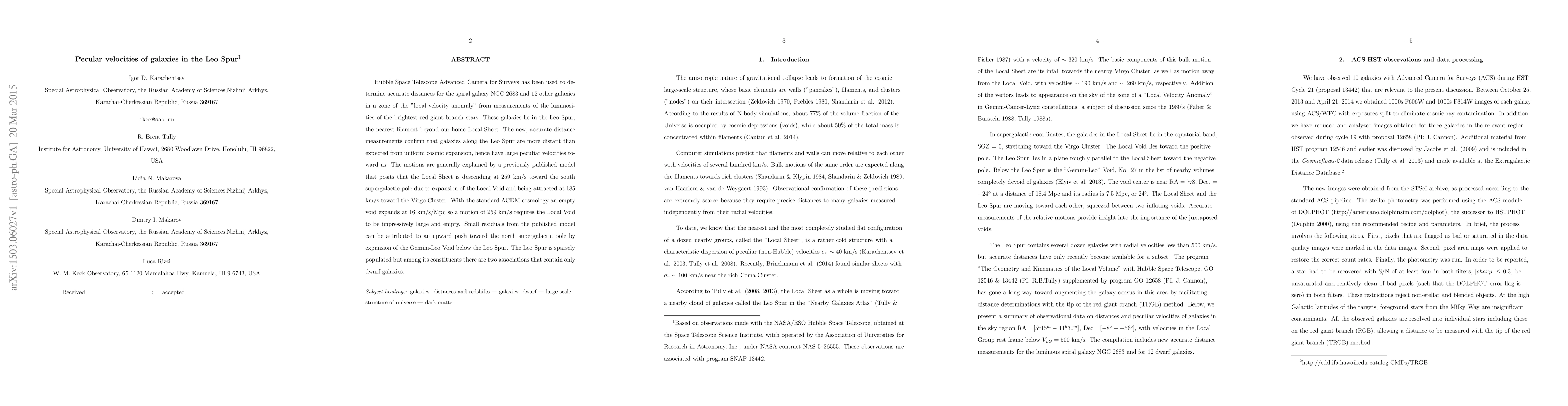 Hubble Space Telescope Advanced Camera for Surveys has been used to determine accurate distances for the spiral galaxy NGC2683 and 12 other galaxies in a zone of the "local velocity anomaly" from measurements of the luminosities of the brightest red giant branch stars. These galaxies lie in the Leo Spur, the nearest filament beyond our home Local Sheet. The new, accurate distance measurements confirm that galaxies along the Leo Spur are more distant than expected from uniform cosmic expansion, hence have large peculiar velocities toward us. The motions are generally explained by a previously published model that posits that the Local Sheet is descending at 259 km/s toward the south supergalactic pole due to expansion of the Local Void and being attracted at 185 km/s toward the Virgo Cluster. With the standard $\Lambda$CDM cosmology an empty void expands at 16 km/s/Mpc so a motion of 259 km/s requires the Local Void to be impressively large and empty. Small residuals from the published model can be attributed to an upward push toward the north supergalactic pole by expansion of the Gemini-Leo Void below the Leo Spur. The Leo Spur is sparsely populated but among its constituents there are two associations that contain only dwarf galaxies.