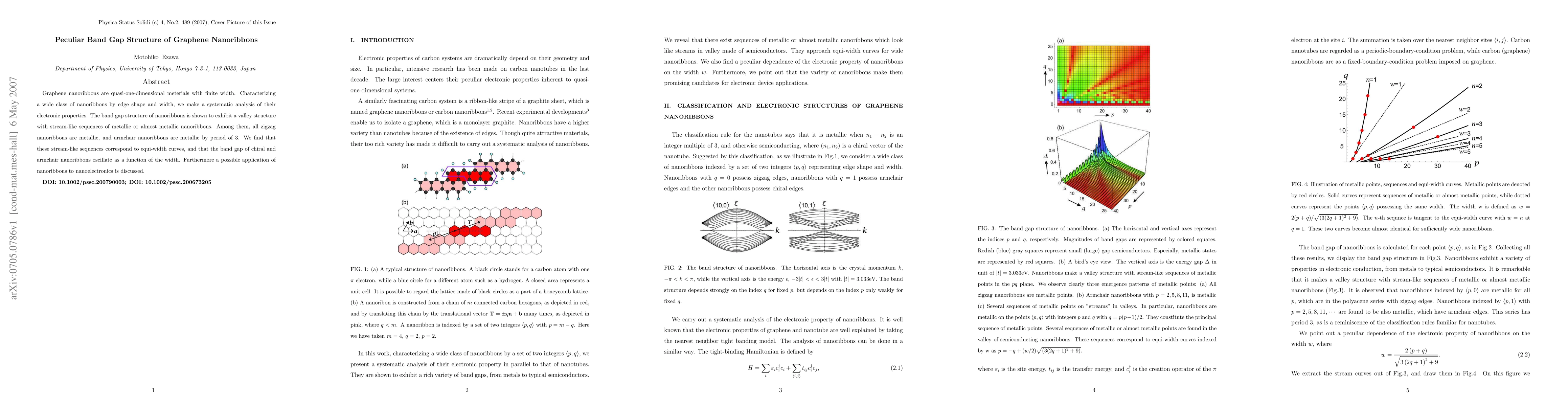 Graphene nanoribbons exhibit a unique band gap structure characterized by stream-like sequences of metallic or nearly metallic nanoribbons; zigzag nanoribbons are always metallic, while armchair nanoribbons are metallic in periodic intervals of three. These findings suggest potential applications in nanoelectronics.
