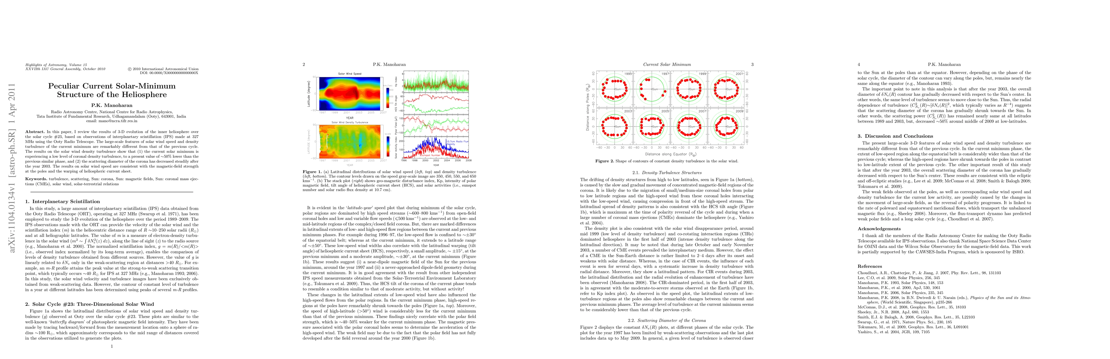 This paper reviews the 3-D evolution of the inner heliosphere during solar cycle #23, revealing significant differences in solar wind speed and density turbulence at the current minimum compared to previous cycles. Notably, the current minimum exhibits ~50% lower coronal density turbulence and a steadily decreasing scattering diameter since 2003.