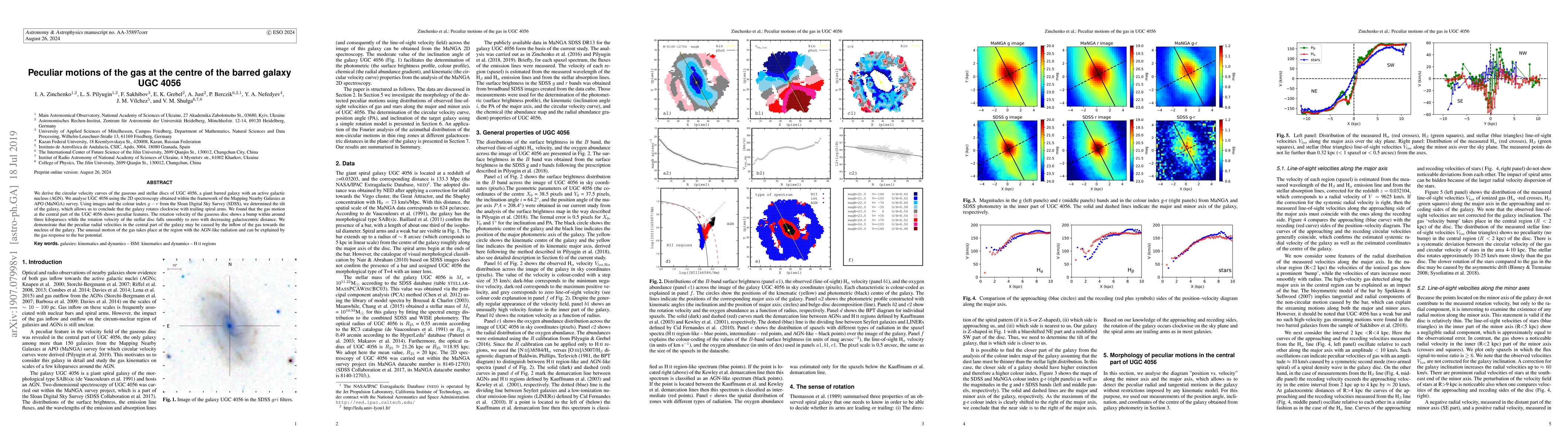 We derive the circular velocity curves of the gaseous and stellar discs of UGC 4056, a giant barred galaxy with an active galactic nucleus (AGN). We analyse UGC 4056 using the 2D spectroscopy obtained within the framework of the Mapping Nearby Galaxies at APO (MaNGA) survey. Using images and the colour index g-r from the Sloan Digital Sky Survey (SDSS), we determined the tilt of the galaxy, which allows us to conclude that the galaxy rotates clockwise with trailing spiral arms. We found that the gas motion at the central part of the UGC 4056 shows peculiar features. The rotation velocity of the gaseous disc shows a bump within around three kiloparsecs while the rotation velocity of the stellar disc falls smoothly to zero with decreasing galactocentric distance. We demonstrate that the peculiar radial velocities in the central part of the galaxy may be caused by the inflow of the gas towards the nucleus of the galaxy. The unusual motion of the gas takes place at the region with the AGN-like radiation and can be explained by the gas response to the bar potential.