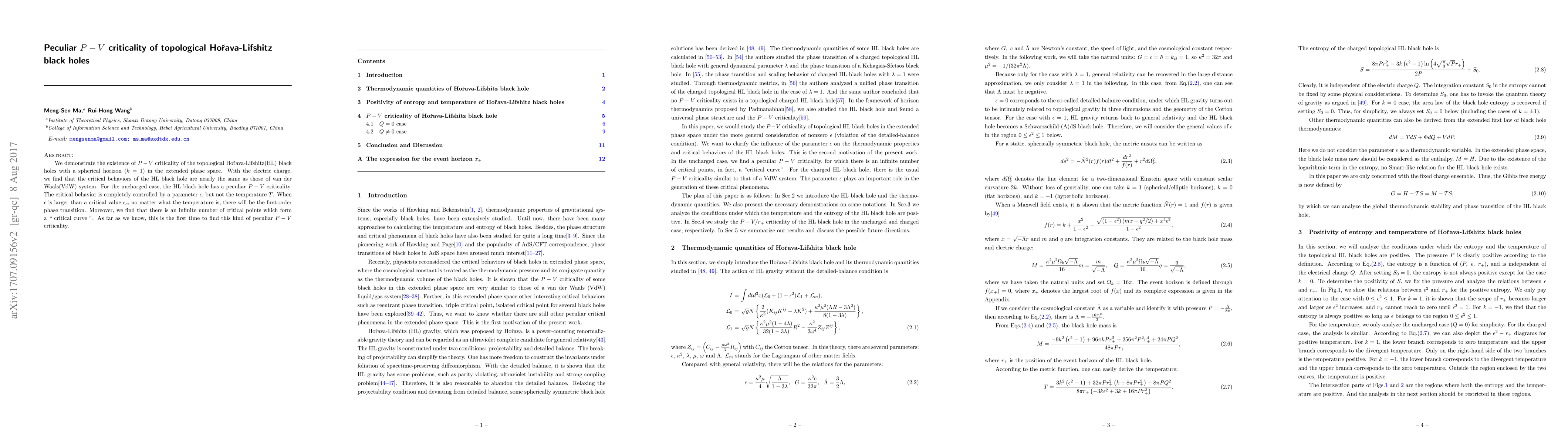 The research reveals unique pressure-volume (P-V) criticality in topological Hov{r}ava-Lifshitz black holes with spherical horizons, displaying behaviors similar to van der Waals systems when electric charge is present. For uncharged cases, the criticality is controlled by a parameter u03c3, not temperature, leading to first-order phase transitions above a critical u03c3u201d_c value. An infinite series of critical points form a 'critical curve', marking the first observation of such peculiar P-V criticality.