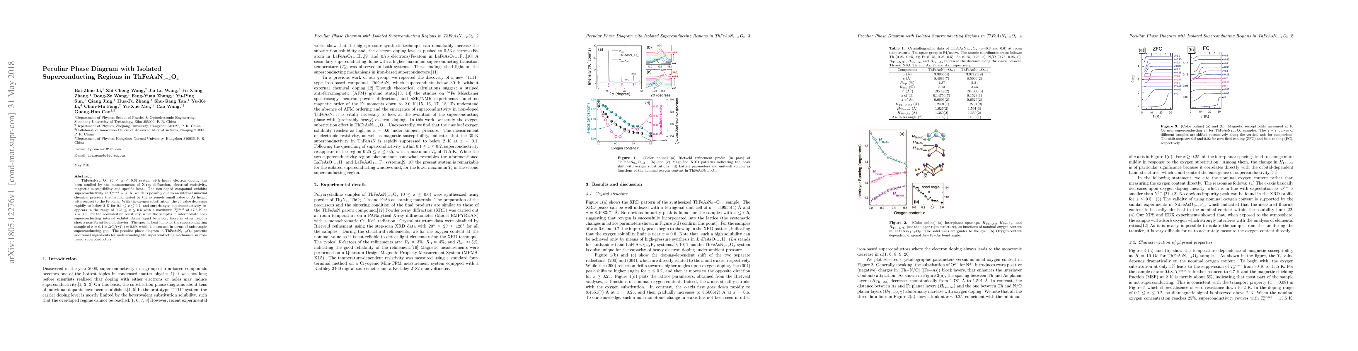 ThFeAsN$_{1-x}$O$_x$ ($0\leq x\leq0.6$) system with heavy electron doping has been studied by the measurements of X-ray diffraction, electrical resistivity, magnetic susceptibility and specific heat. The non-doped compound exhibits superconductivity at $T_\mathrm{c}^\mathrm{onset}=30$ K, which is possibly due to an internal uniaxial chemical pressure that is manifested by the extremely small value of As height with respect to the Fe plane. With the oxygen substitution, the $T_\mathrm{c}$ value decreases rapidly to below 2 K for $0.1\leq x\leq0.2$, and surprisingly, superconductivity re-appears in the range of $0.25\leq x\leq0.5$ with a maximum $T_\mathrm{c}^\mathrm{onset}$ of 17.5 K at $x=0.3$. For the normal-state resistivity, while the samples in intermediate non-superconducting interval exhibit Fermi liquid behavior, those in other regions show a non-Fermi-liquid behavior. The specific heat jump for the superconducting sample of $x=0.4$ is $\Delta C/(\gamma T_\mathrm{c})=0.89$, which is discussed in terms of anisotropic superconducting gap. The peculiar phase diagram in ThFeAsN$_{1-x}$O$_x$ presents additional ingredients for understanding the superconducting mechanism in iron-based superconductors.
