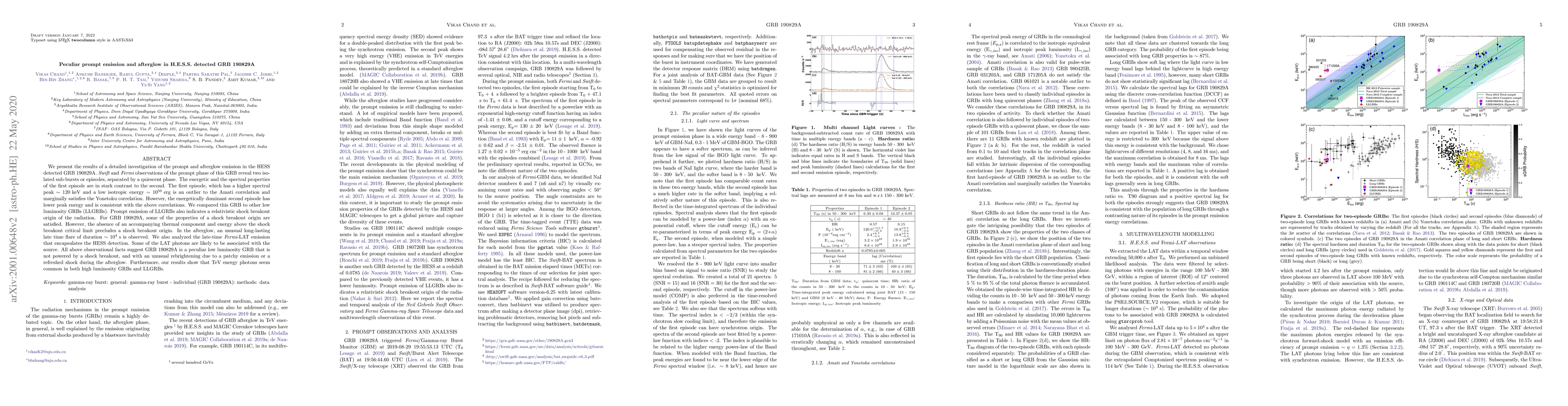 This paper investigates the peculiar prompt and afterglow emissions of GRB 190829A, revealing two distinct sub-bursts with contrasting energetic and spectral properties. The afterglow features an unusual long-lasting flare, suggesting a patchy emission or refreshed shock, while TeV photons are common in both low and high luminosity GRBs.