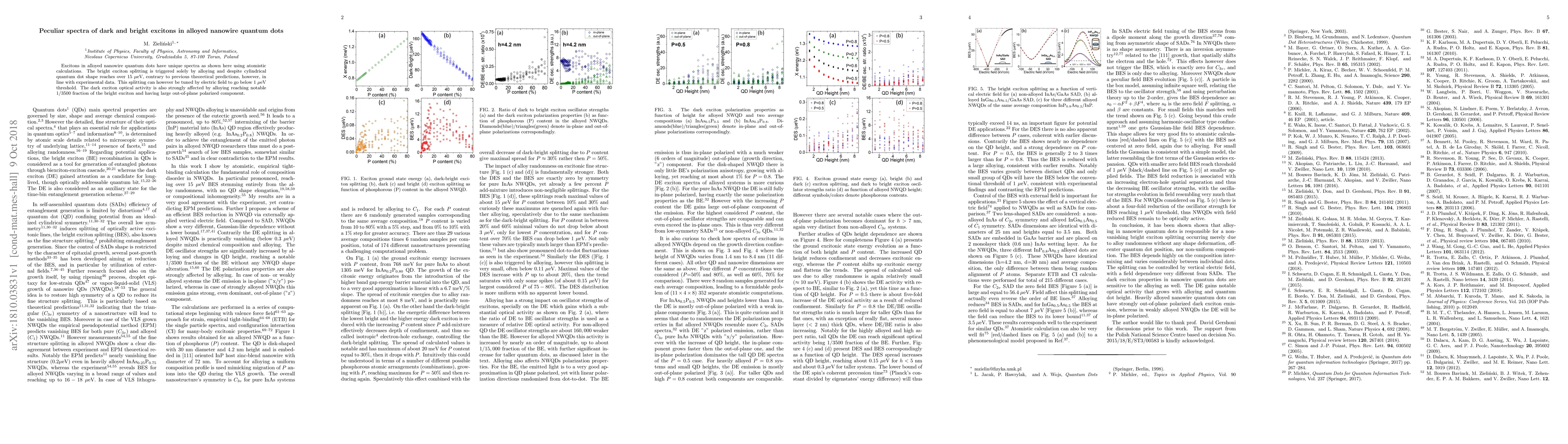 This paper reveals unique spectral characteristics of excitons in alloyed nanowire quantum dots, showing that bright exciton splitting exceeds $15~\mu$eV due to alloying alone, contrary to prior theoretical predictions but consistent with experimental data. The dark exciton optical activity is significantly influenced by alloying, with a notable $1/3500$ fraction of the bright exciton and a large out-of-plane polarized component.