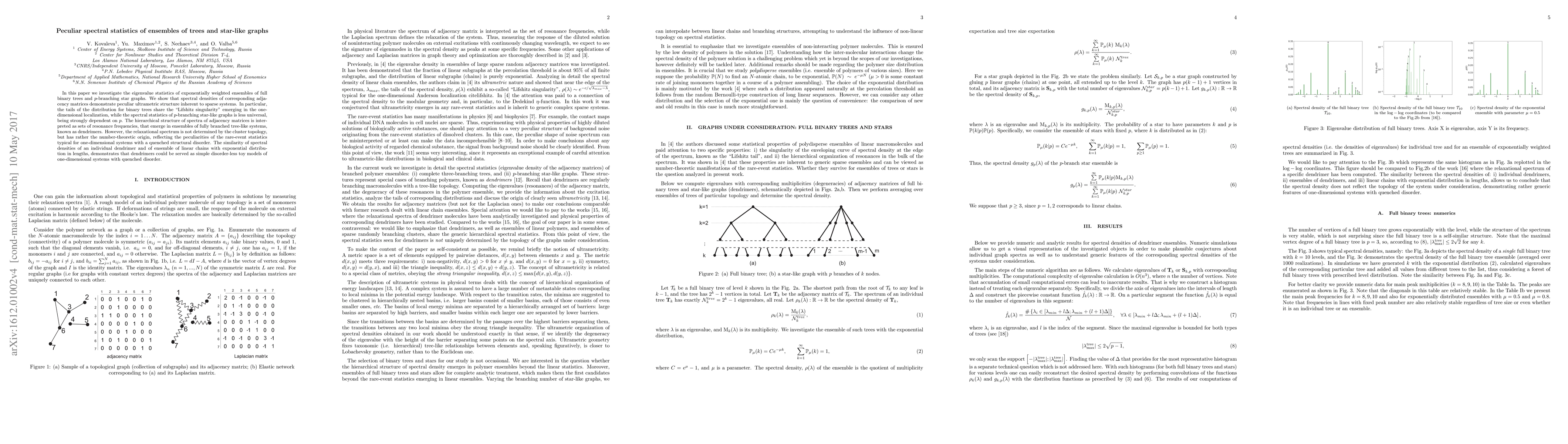 In this paper we investigate the eigenvalue statistics of exponentially weighted ensembles of full binary trees and $p$-branching star graphs. We show that spectral densities of corresponding adjacency matrices demonstrate peculiar ultrametric structure inherent to sparse systems. In particular, the tails of the distribution for binary trees share the "Lifshitz singularity" emerging in the one-dimensional localization, while the spectral statistics of $p$-branching star-like graphs is less universal, being strongly dependent on $p$. The hierarchical structure of spectra of adjacency matrices is interpreted as sets of resonance frequencies, that emerge in ensembles of fully branched tree-like systems, known as dendrimers. However, the relaxational spectrum is not determined by the cluster topology, but has rather the number-theoretic origin, reflecting the peculiarities of the rare-event statistics typical for one-dimensional systems with a quenched structural disorder. The similarity of spectral densities of an individual dendrimer and of ensemble of linear chains with exponential distribution in lengths, demonstrates that dendrimers could be served as simple disorder-less toy models of one-dimensional systems with quenched disorder.