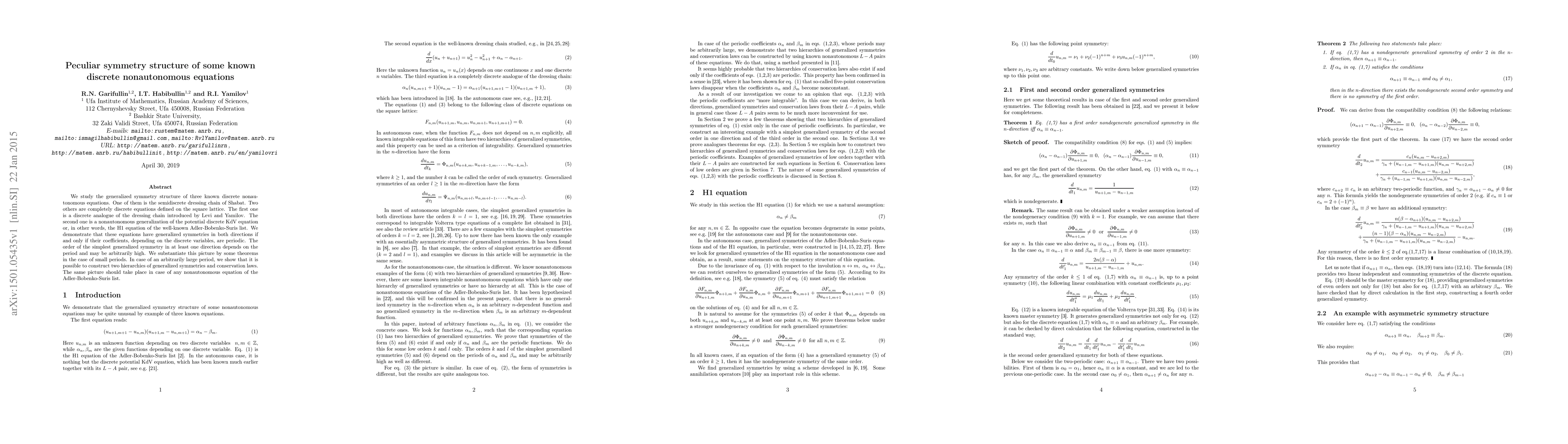 We study the generalized symmetry structure of three known discrete nonautonomous equations. One of them is the semidiscrete dressing chain of Shabat. Two others are completely discrete equations defined on the square lattice. The first one is a discrete analogue of the dressing chain introduced by Levi and Yamilov. The second one is a nonautonomous generalization of the potential discrete KdV equation or, in other words, the H1 equation of the well-known Adler-Bobenko-Suris list. We demonstrate that these equations have generalized symmetries in both directions if and only if their coefficients, depending on the discrete variables, are periodic. The order of the simplest generalized symmetry in at least one direction depends on the period and may be arbitrarily high. We substantiate this picture by some theorems in the case of small periods. In case of an arbitrarily large period, we show that it is possible to construct two hierarchies of generalized symmetries and conservation laws. The same picture should take place in case of any nonautonomous equation of the Adler-Bobenko-Suris list.