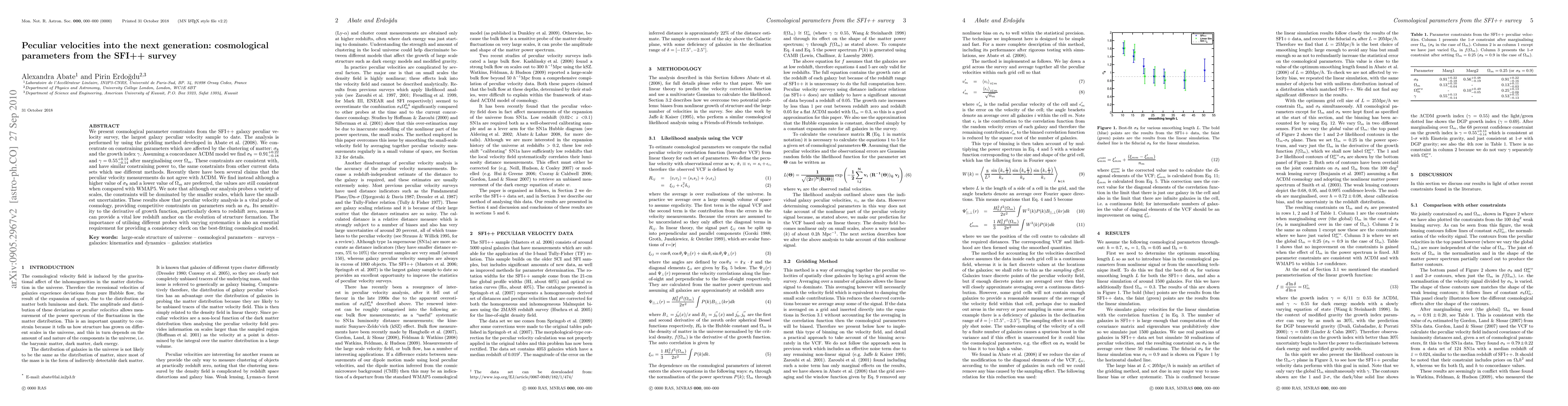 This paper presents cosmological parameter constraints from the SFI++ galaxy peculiar velocity survey, finding sigma_8=0.91+0.22-0.18 and gamma=0.55+0.13-0.14 within a concordance LCDM model, consistent with other datasets. It highlights the survey's importance as a competitive probe of cosmology, particularly for low redshift structure formation.