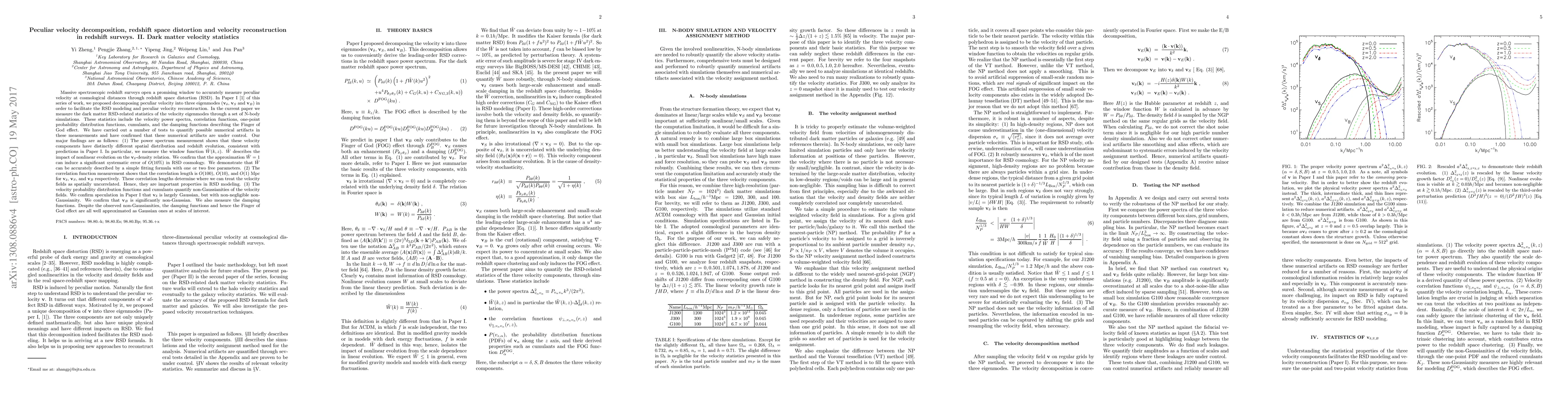 This paper measures dark matter velocity statistics from N-body simulations, focusing on redshift space distortion (RSD) in spectroscopic surveys. It finds distinct spatial distributions and evolutions for the three decomposed peculiar velocity eigen-modes, with significant systematic errors due to nonlinear evolution. The study also quantifies non-Gaussianities in the velocity fields and confirms that the Finger of God effect is well approximated by Gaussian damping functions.