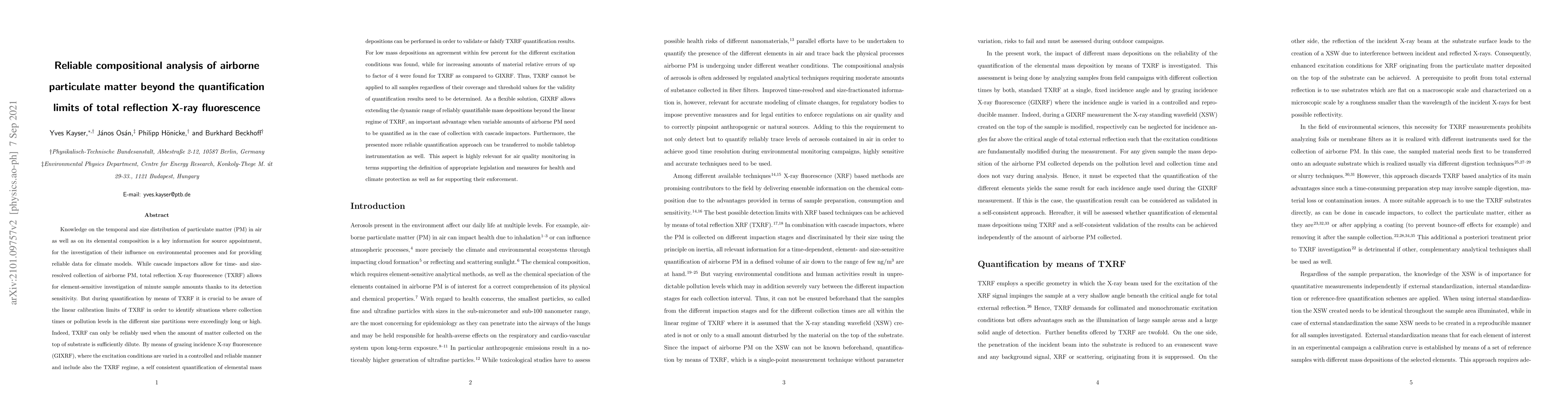 Knowledge on the temporal and size distribution of particulate matter (PM) in air as well as on its elemental composition is a key information for source appointment, for the investigation of their influence on environmental processes and for providing valid data for climate models. A prerequisite is that size fractionated sampling times of few hours must be achieved such that anthropogenic and natural emissions can be correctly identified. While cascade impactors allow for time- and size-resolved collection of airborne PM, total reflection X-ray fluorescence (TXRF) allows for element-sensitive investigation of low sample amounts thanks to its detection sensitivity. However, during quantification by means of TXRF it is crucial to be aware of the limits of TXRF in order to identify situations where collection times or pollution levels were exceedingly long or high. It will be shown by means of grazing incidence X-ray fluorescence (GIXRF), where different reflection conditions are probed, that a self consistent quantification of elemental mass depositions can be performed in order to validate or identify issues in quantification by means of TXRF. Furthermore, monitors of validity for a reliable quantification of the elemental composition of PM by means of TXRF will be introduced. The methodological approach presented can be transferred to tabletop instrumentation in order to guarantee a reliable quantification on an element sensitive basis of the PM collected. This aspect is highly relevant for defining appropriate legislation and measures for health and climate protection and for supporting their enforcement and monitoring.