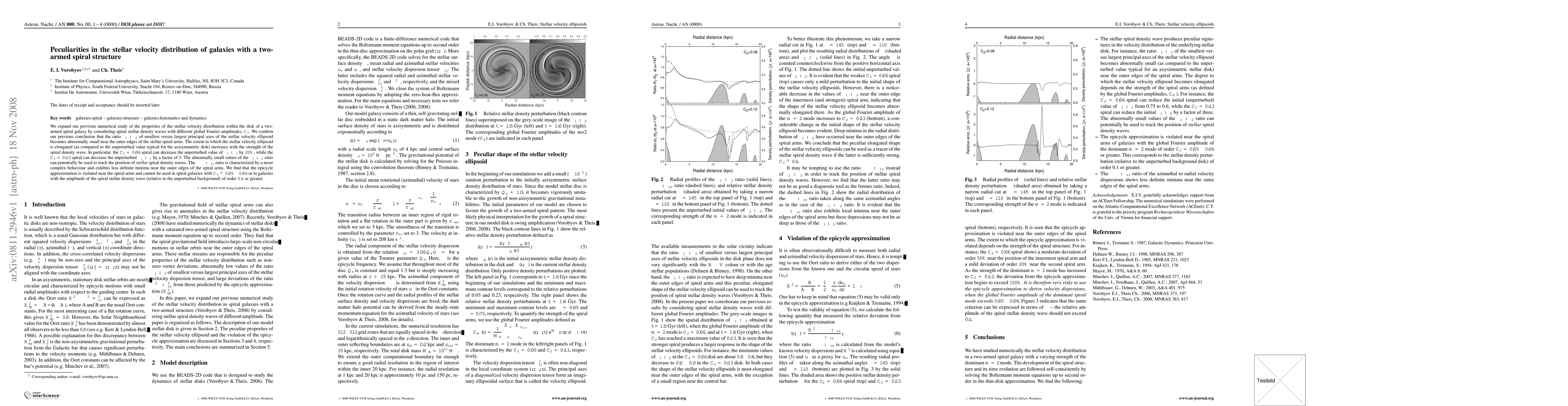 This study investigates the stellar velocity distribution in two-armed spiral galaxies, finding that the ratio of the smallest to largest principal axes of the stellar velocity ellipsoid decreases significantly near the outer edges of the spiral arms, especially with stronger spiral density waves. The epicycle approximation fails in galaxies with spiral density wave amplitudes of 0.1 or greater.