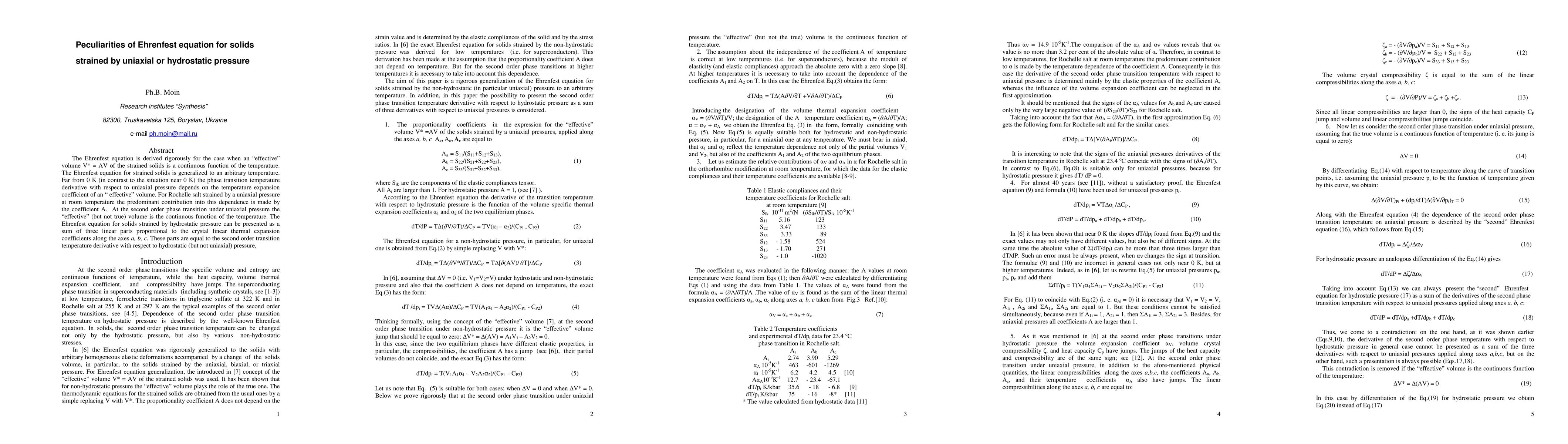This paper rigorously derives the Ehrenfest equation for solids under uniaxial or hydrostatic pressure, showing that the phase transition temperature derivative depends on the temperature expansion coefficient of an 'effective' volume. It highlights that the equation's behavior varies significantly at different temperatures, with distinct contributions from coefficients under uniaxial versus hydrostatic pressure.