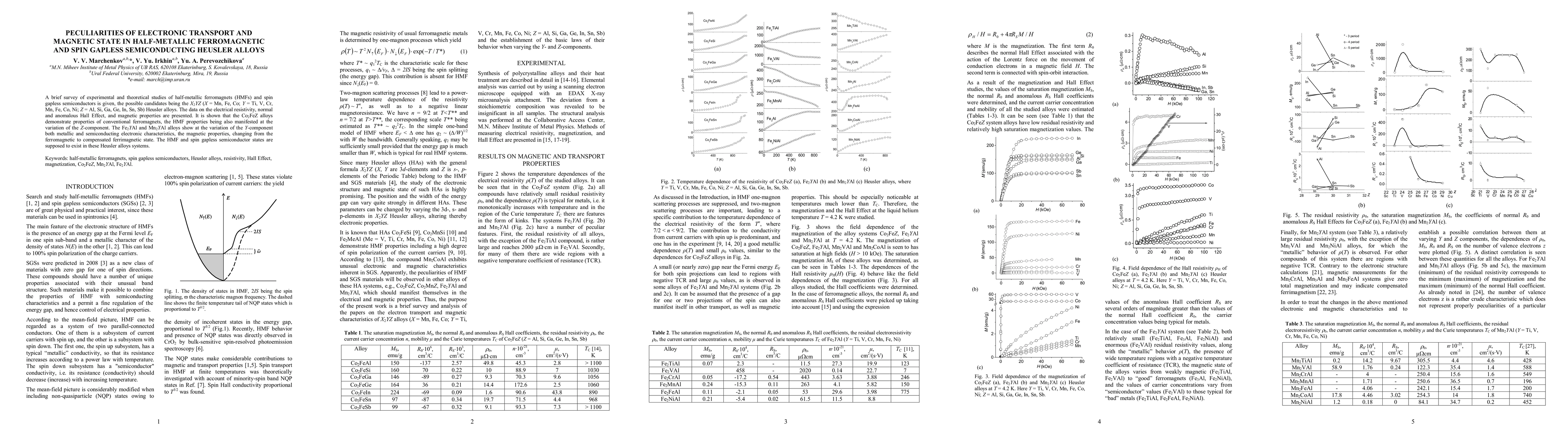 A brief survey of experimental and theoretical studies of half-metallic ferromagnets (HMFs) and spin gapless semiconductors is given, the possible candidates being the X$_2$YZ (X = Mn, Fe, Co; Y = Ti, V, Cr, Mn, Fe, Co, Ni; Z = Al, Si, Ga, Ge, In, Sn, Sb) Heusler alloys. The data on the electrical resistivity, normal and anomalous Hall Effect, and magnetic properties are presented. It is shown that the Co$_2$FeZ alloys demonstrate properties of conventional ferromagnets, the HMF properties being also manifested at the variation of the Z-component. The Fe$_2$YAl and Mn$_2$YAl alloys show at the variation of the Y-component both metallic and semiconducting electronic characteristics, the magnetic properties, changing from the ferromagnetic to compensated ferrimagnetic state. The HMF and spin gapless semiconductor states are supposed to exist in these Heusler alloys systems.