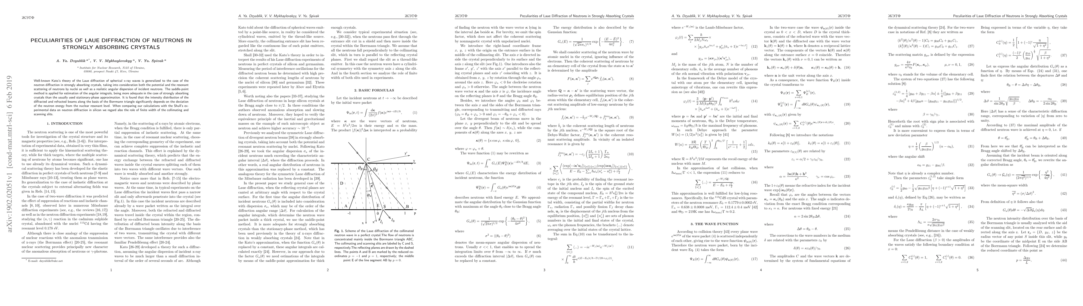 Researchers generalized Kato's theory to neutron diffraction in strongly absorbing crystals, considering resonant scattering and angular dispersion, revealing intensity distribution depends on neutron energy deviation from nuclear resonance levels.