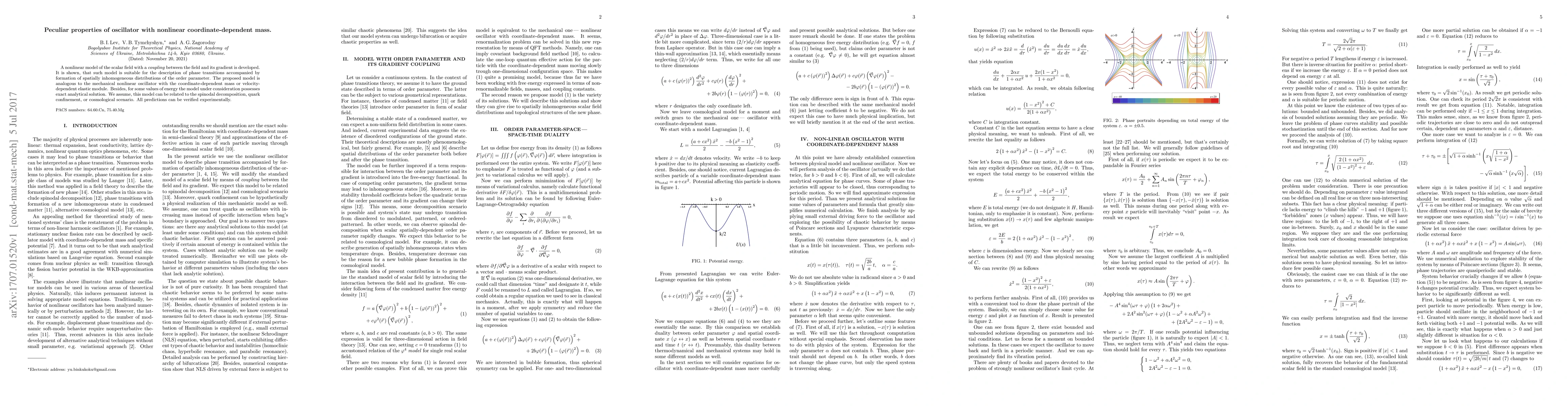 A nonlinear model of the scalar field with a coupling between the field and its gradient is developed. It is shown, that such model is suitable for the description of phase transition accompanied by formation of spatial inhomogeneous distribution of the order parameter. The proposed model is analogous the mechanical nonlinear oscillator with the coordinate-dependent mass or velocity-dependent elastic module. Besides, for some value of energy the model under consideration possesses exact analytical solution. We assume that this model can related to the spinodal decomposition, quark confinement, or cosmological scenario. All predictions can be verified experimentally.