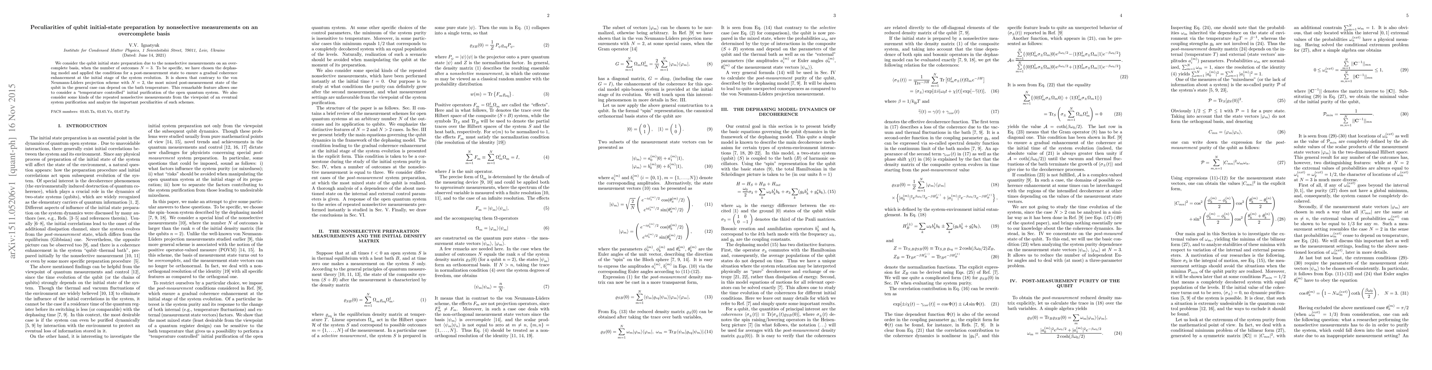 We consider the qubit initial state preparation due to the nonselective measurements on an overcomplete basis, when the number of outcomes $N=3$. To be specific, we have chosen the dephasing model and applied the conditions for a post-measurement state to ensure a gradual coherence enhancement at the initial stage of the system evolution. It is shown that contrary to the von Neumann-L\"uders projection scheme with $N=2$, the most mixed post-measurement state of the qubit in the general case can depend on the bath temperature. This remarkable feature allows one to consider a ``temperature controlled'' initial purification of the open quantum system. We also consider some kinds of the repeated nonselective measurements from the viewpoint of an eventual system purification and analyze the important peculiarities of such schemes.