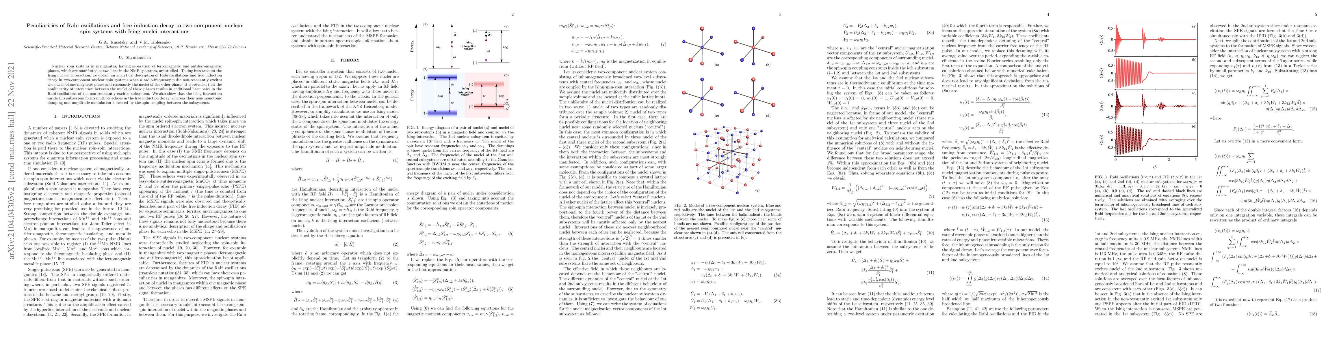 This paper investigates nuclear spin systems in manganites with Ising interactions, revealing that non-resonant excitation of one magnetic phase and resonant excitation of another leads to nonlinear Rabi oscillations and multiple echoes in free induction decay due to spin coupling between subsystems.