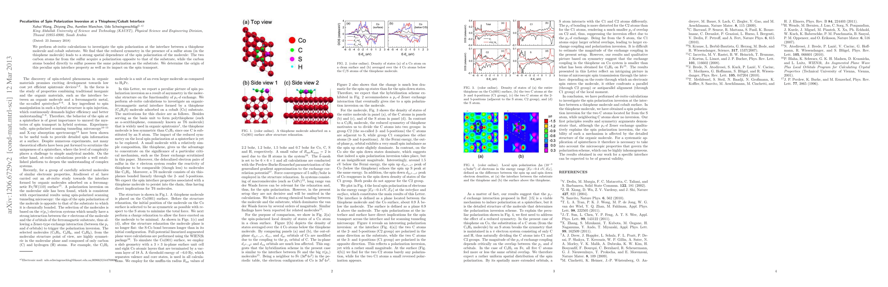 This study uses ab-initio calculations to explore spin polarization at the thiophene/cobalt interface, revealing that sulfur atom presence causes spatial spin polarization inversion: carbon atoms distant from sulfur exhibit opposite polarization to the substrate, while those bonded directly to sulfur align with the substrate. The research also assesses the effect of this unique spin interface property on spin transport.
