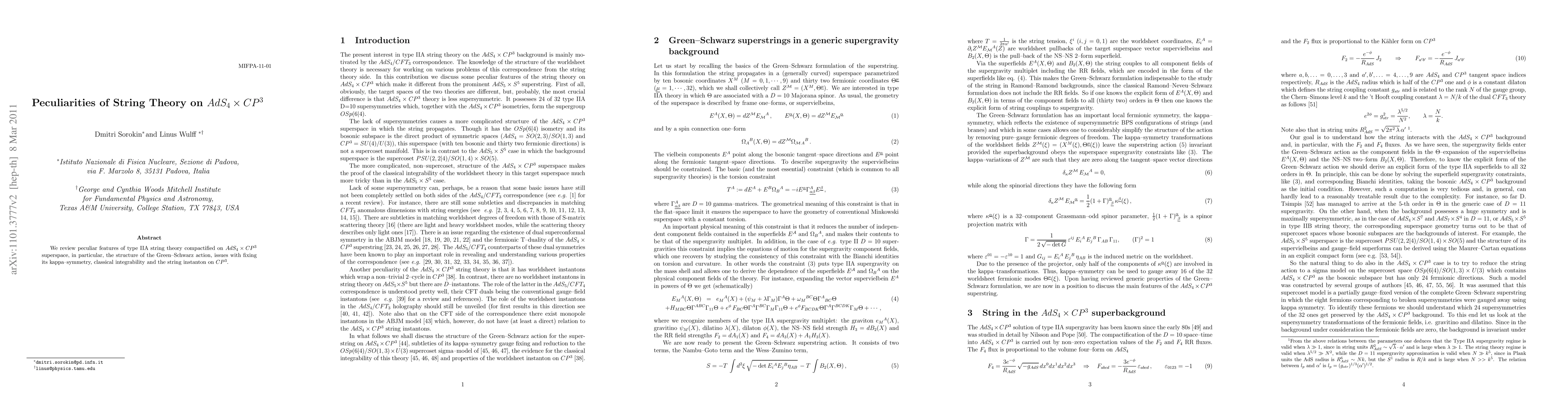 We review peculiar features of type IIA string theory compactified on AdS(4) x CP(3) superspace, in particular, the structure of the Green-Schwarz action, issues with fixing its kappa-symmetry, classical integrability and the string instanton on CP(3)