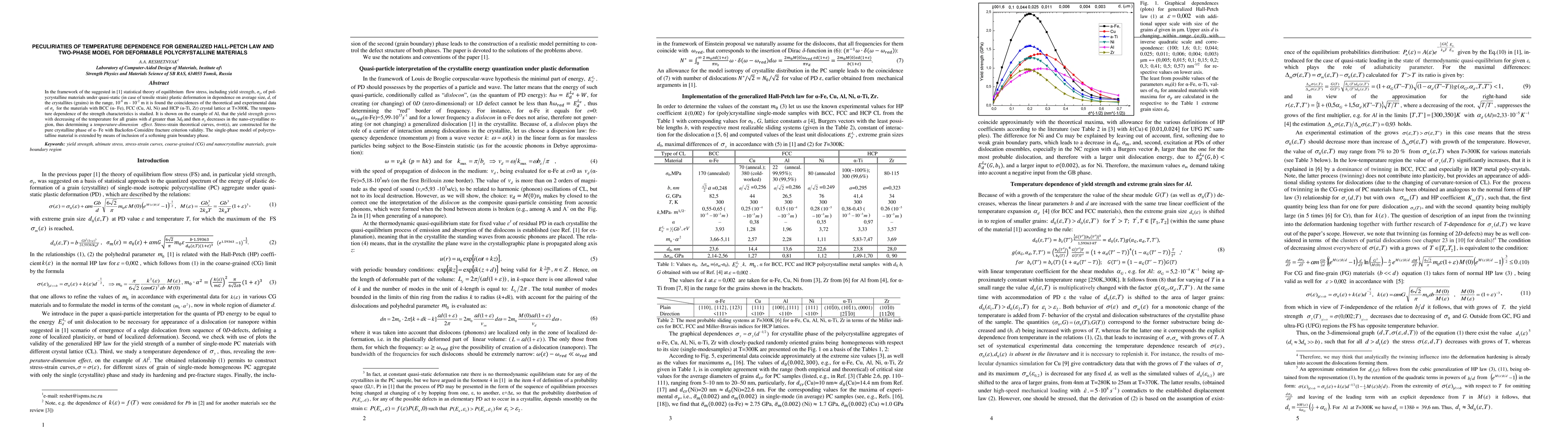 In the framework of the suggested in [arxiv:1803.08247 [cond-mat.mtrl-sci]] statistical theory of the equilibrium flow stress, including yield strength, ${\sigma}_y$, of polycrystalline materials under quasi-static (in case of tensile strain) plastic deformation in dependence on average size, d, of the crystallites (grains) in the range, $10^{-8}$ m - $10^{-2}$ m. it is found the coincidences of the theoretical and experimental data of ${\sigma}_y$ for the materials with BCC (${\alpha}$- Fe), FCC (Cu, Al, Ni) and HCP (${\alpha}$-Ti, Zr) crystal lattice at T=300K. The temperature dependence of the strength characteristics is studied. It is shown on the example of Al, that the yield strength grows with decreasing of the temperature for all grains with d greater than $3*d_0$ (with $d_0$ being extremal size of the grain for maximal ${\sigma}_y$) and then ${\sigma}_y$ decreases in the nano-crystalline region, thus determining a temperature-dimension effect. Stress-strain curves, ${\sigma}={\sigma}({\epsilon})$, are constructed for the pure crystalline phase of ${\alpha}$-Fe with Backofen-Consid\'ere fracture criterion validity. The single-phase model of polycrystalline material is augmented by means of inclusion of a softening grain boundary phase.