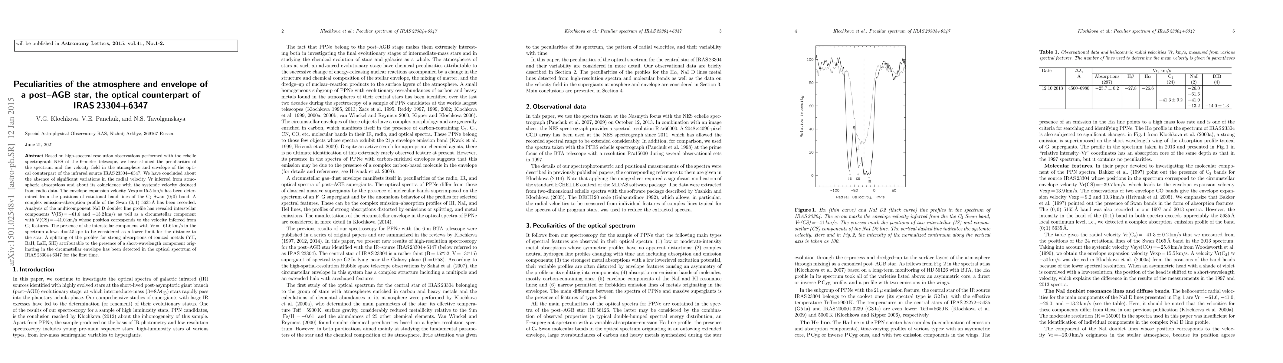 Based on high-spectral resolution observations performed with the echelle spectrograph NES of the 6-meter telescope, we have studied the peculiarities of the spectrum and the velocity field in the atmosphere and envelope of the optical counterpart of the infrared source IRAS 23304+6347. We have concluded about the absence of significant variations in the radial velocity Vr inferred from atmospheric absorptions and about its coincidence with the systemic velocity deduced from radio data. The envelope expansion velocity Vexp=15.5 km/s has been determined from the positions of rotational band lines of the C$_2$ Swan (0; 0) band. A complex emission-absorption profile of the Swan (0; 1) 5635 \AA{} has been recorded. Analysis of the multicomponent NaI~D doublet line profile has revealed interstellar components V(IS)=$-61.6$ and $-13.2$ km/s as well as a circumstellar component with V(CS)=$-41.0$ km/s whose position corresponds to the velocity inferred from C$_2$ features. The presence of the interstellar component with Vr=$-61.6$ km/s in the spectrum allows d=2.5 kpc to be considered as a lower limit for the distance to the star. A splitting of the profiles for strong absorptions of ionized metals (YII, BaII, LaII, SiII) attributable to the presence of a short-wavelength component originating in the circumstellar envelope has been detected in the optical spectrum of IRAS23304+6347 for the first time.