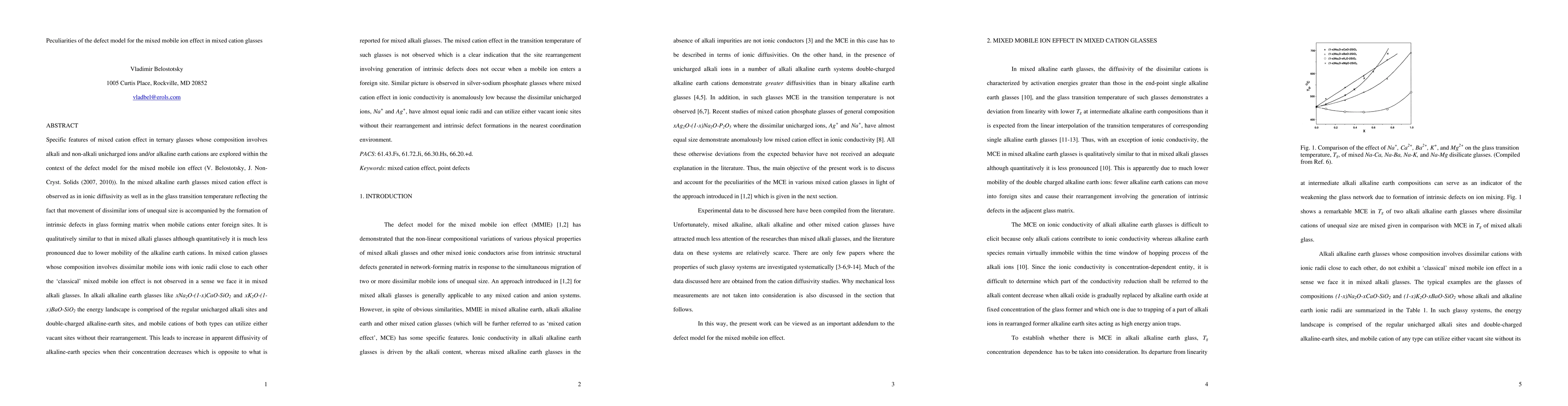 This paper explores the mixed cation effect in ternary glasses containing alkali and non-alkali ions, revealing that the defect model for mixed mobile ion effect leads to intrinsic defect formation in mixed alkaline earth glasses. In contrast, similar effects are not observed in glasses with ions of similar ionic radii, indicating no site rearrangement or intrinsic defect generation.