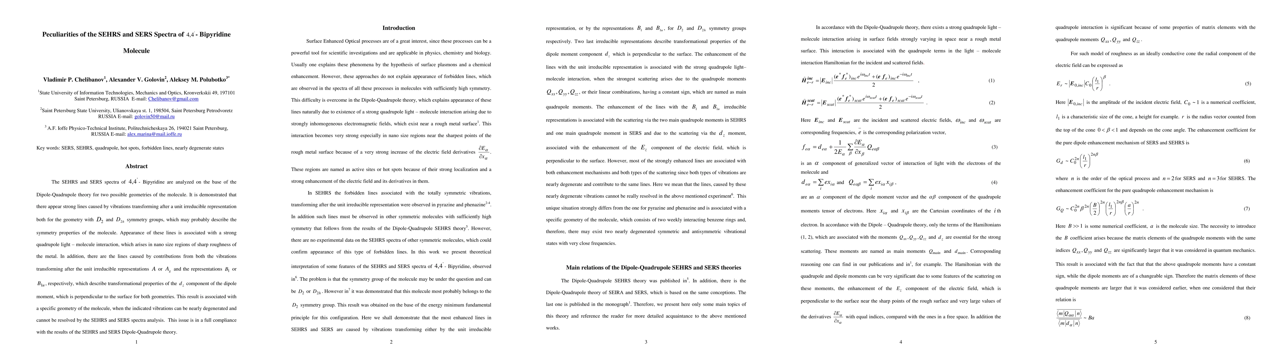 The SEHRS and SERS spactra of 4,4 - Bipyridine are analyzed on the base of the Dipole-Quadrupole theory for two possible geometries of the molecule. It is demonstrated that there appear strong lines caused by vibrations transforming after a unit irreducible representation both for the geometry with D2 and D2h symmetry groups, which may probably describe the symmetry properties of the molecule. Appearance of these lines is associated with a strong quadrupole light-molecule interaction, which arises in nano size rregions of sharp roughness of the metal. In addition, there are the lines caused by contributions from both the vibrations transforming after the unit irredicible representations A or Ag and the representations B1 or B1u, respectively, which describe transformational properties of the Ez component of the dipole moment, which is perpendicular to the surface for both geometries. This result is associated with a specific geometry of the molecule, when the indicated vibrations can be nearly degenerated and can not be resolved by the SEHRS and SERS spectra analysis. This issue is in a full compliance with the results of the SEHRS and SERS Dipole-Quadrupole theory.
