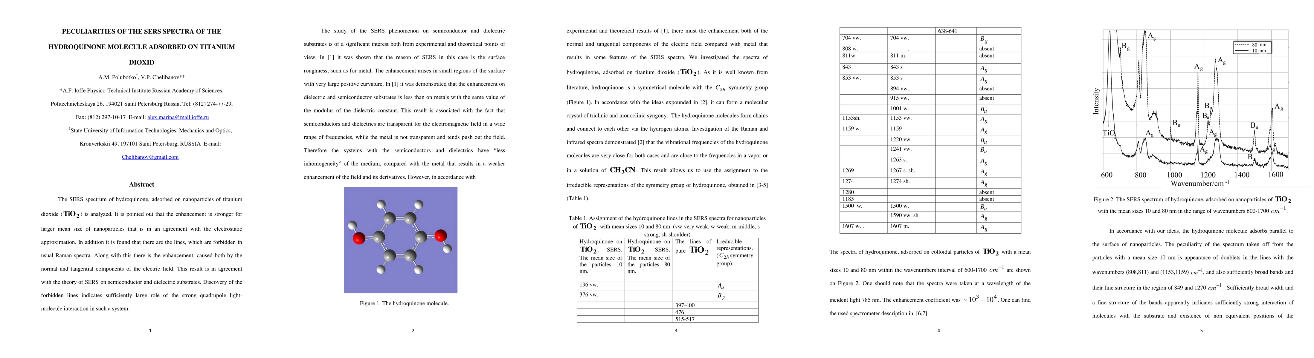 The research examines the Surface Enhanced Raman Spectroscopy (SERS) of hydroquinone adsorbed on titanium dioxide nanoparticles. Key findings include stronger enhancement for larger nanoparticle sizes, as predicted by electrostatic approximation. The study also identifies forbidden Raman lines, suggesting significant quadrupole light-molecule interaction, and confirms enhancement from both normal and tangential electric field components, aligning with SERS theory on semiconductors and dielectrics.