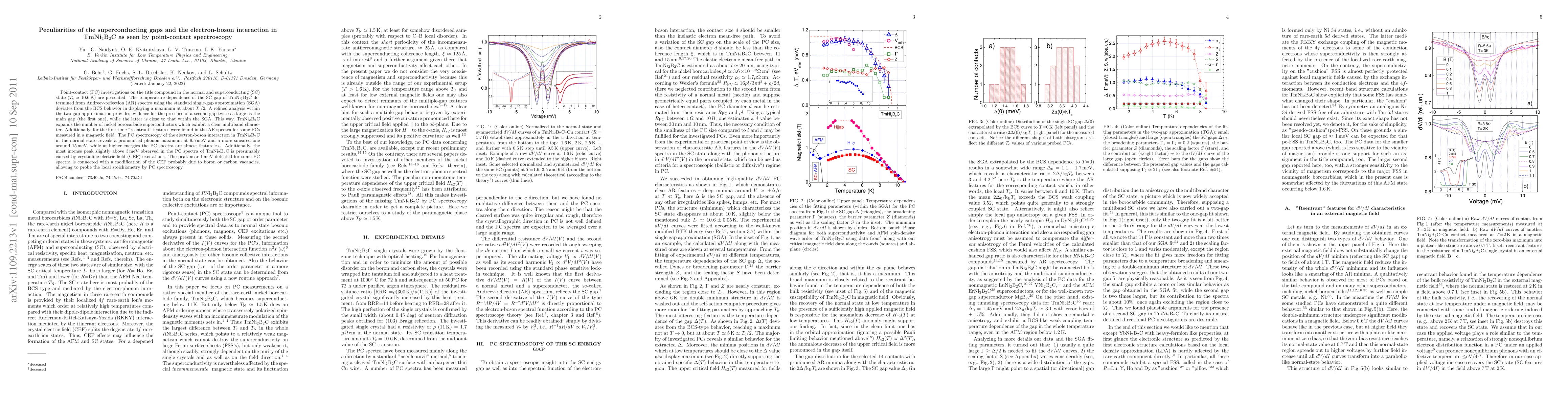 Point-contact (PC) investigations on the title compound in the normal and superconducting (SC) state (Tc=10,6 K) are presented. The temperature dependence of the SC gap of TmNi2B2C determined from Andreev-reflection (AR) spectra using the standard single-gap approximation (SGA) deviates from the BCS behavior in displaying a maximum at about Tc/2. A refined analysis within the two-gap approximation provides evidence for the presence of a second gap twice as large as the main gap (the first one), while the latter is close to that within the SGA. This way, TmNi2B2C expands the number of nickel borocarbide superconductors which exhibit a clear multiband character. Additionally, for the first time "reentrant" features were found in the AR spectra for some PCs measured in a magnetic field. The PC spectroscopy of the electron-boson interaction in TmNi2B2C in the normal state reveals a pronounced phonon maximum at 9.5meV and a more smeared one around 15 meV, while at higher energies the PC spectra are almost featureless. Additionally, the most intense peak slightly above 3meV observed in the PC spectra of TmNi2B2C is presumably caused by crystalline-electric-field (CEF) excitations. The peak near 1meV detected for some PC spectra is connected with a modification of the CEF probably due to boron or carbon vacancies, allowing to probe the local stoichiometry by PC spectroscopy.