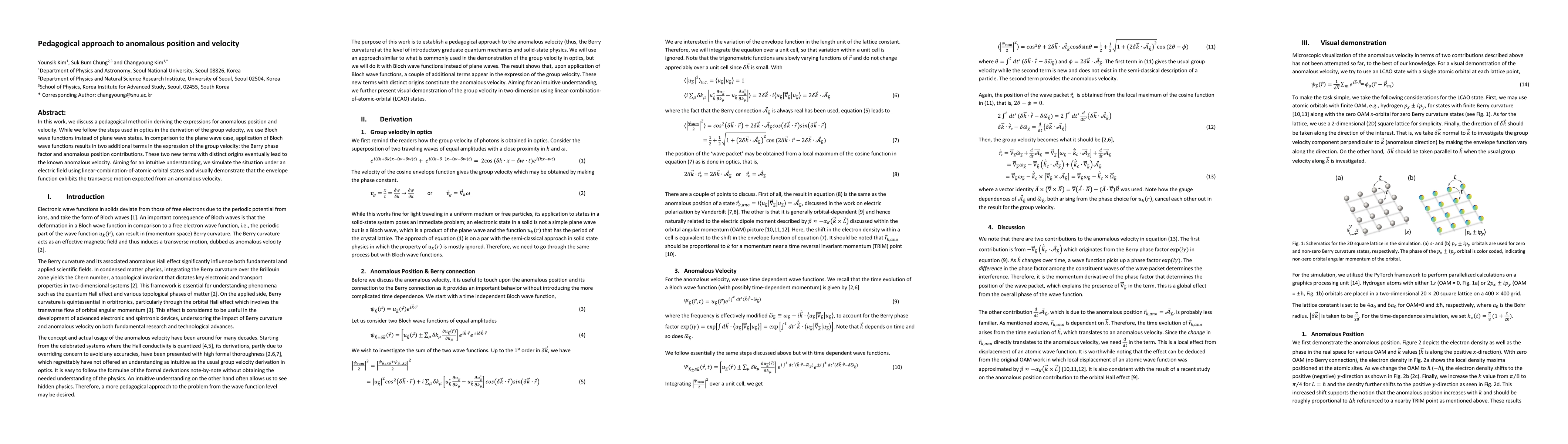 This paper introduces a novel pedagogical approach to derive anomalous position and velocity expressions using Bloch wave functions instead of plane waves, revealing additional terms like the Berry phase factor and anomalous position contributions. Simulation under electric field confirms the transverse motion indicative of anomalous velocity.