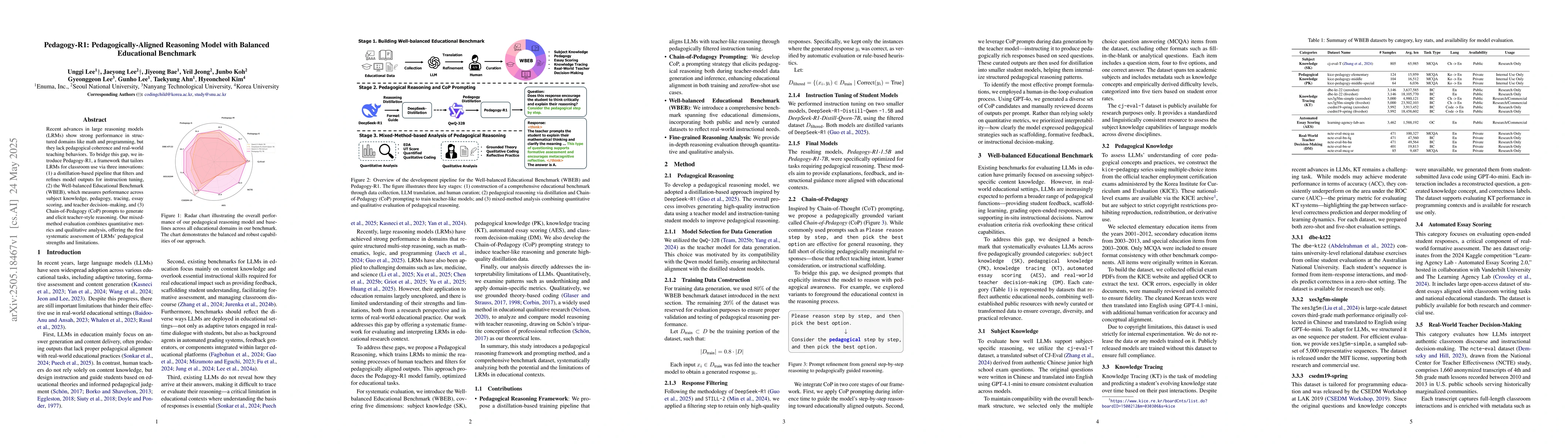 Recent advances in large reasoning models (LRMs) show strong performance in structured domains such as mathematics and programming; however, they often lack pedagogical coherence and realistic teaching behaviors. To bridge this gap, we introduce Pedagogy-R1, a framework that adapts LRMs for classroom use through three innovations: (1) a distillation-based pipeline that filters and refines model outputs for instruction-tuning, (2) the Well-balanced Educational Benchmark (WBEB), which evaluates performance across subject knowledge, pedagogical knowledge, tracing, essay scoring, and teacher decision-making, and (3) a Chain-of-Pedagogy (CoP) prompting strategy for generating and eliciting teacher-style reasoning. Our mixed-method evaluation combines quantitative metrics with qualitative analysis, providing the first systematic assessment of LRMs' pedagogical strengths and limitations.