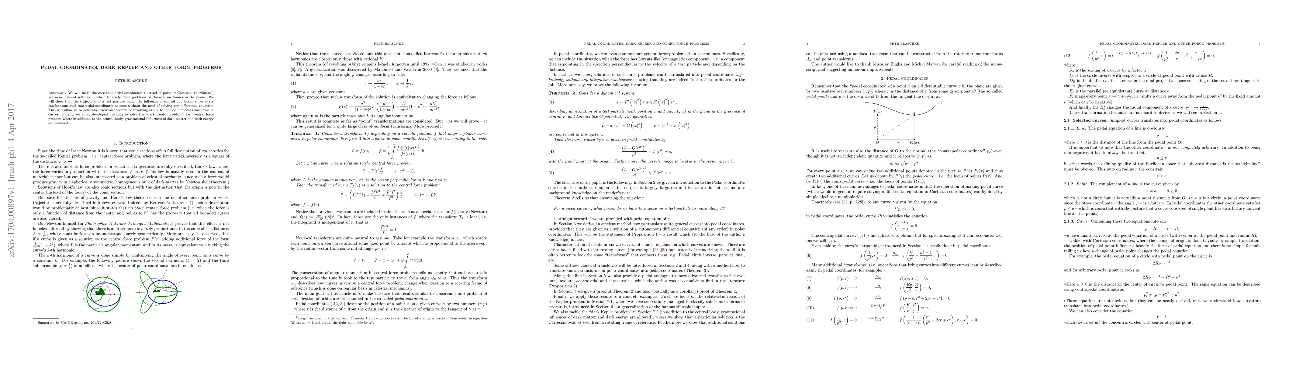 We will make the case that \textit{pedal coordinates} (instead of polar or Cartesian coordinates) are more natural settings in which to study force problems of classical mechanics in the plane. We will show that the trajectory of a test particle under the influence of central and Lorentz-like forces can be translated into pedal coordinates at once without the need of solving any differential equation. This will allow us to generalize Newton theorem of revolving orbits to include nonlocal transforms of curves. Finally, we apply developed methods to solve the "dark Kepler problem", i.e. central force problem where in addition to the central body, gravitational influences of dark matter and dark energy are assumed.
