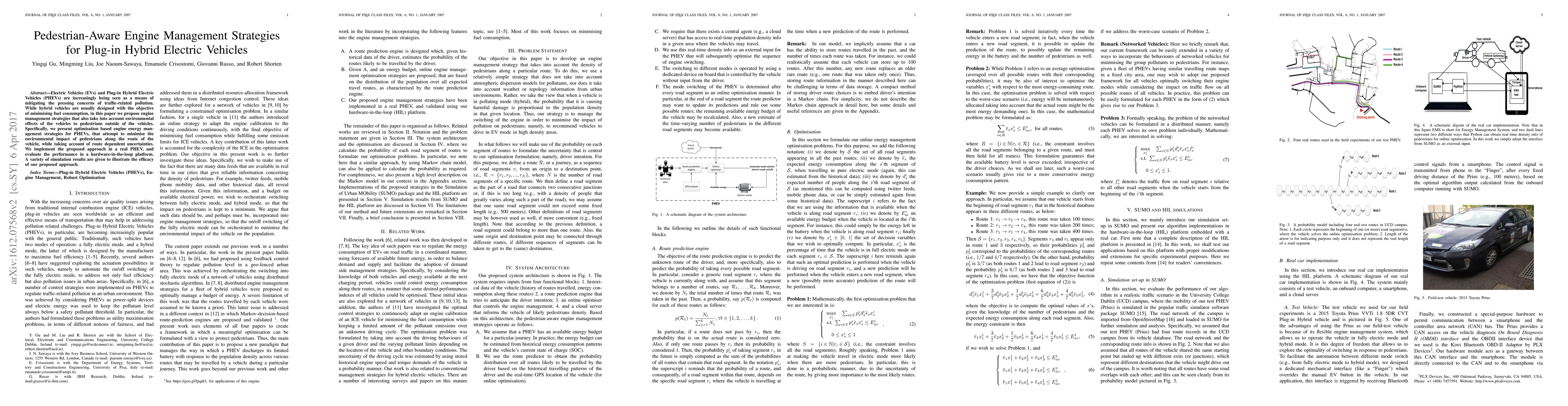This paper proposes optimisation-based engine management strategies for Plug-in Hybrid Electric Vehicles (PHEVs) that aim to reduce the environmental impact on pedestrians along the vehicle’s route. The strategies are evaluated on a real PHEV in a hardware-in-the-loop setup, demonstrating their effectiveness through various simulation results.