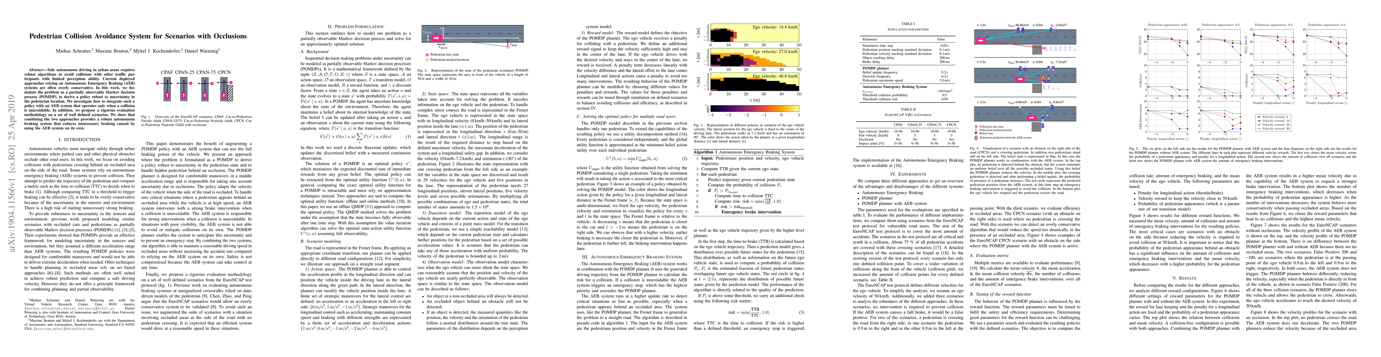 Safe autonomous driving in urban areas requires robust algorithms to avoid collisions with other traffic participants with limited perception ability. Current deployed approaches relying on Autonomous Emergency Braking (AEB) systems are often overly conservative. In this work, we formulate the problem as a partially observable Markov decision process (POMDP), to derive a policy robust to uncertainty in the pedestrian location. We investigate how to integrate such a policy with an AEB system that operates only when a collision is unavoidable. In addition, we propose a rigorous evaluation methodology on a set of well defined scenarios. We show that combining the two approaches provides a robust autonomous braking system that reduces unnecessary braking caused by using the AEB system on its own.