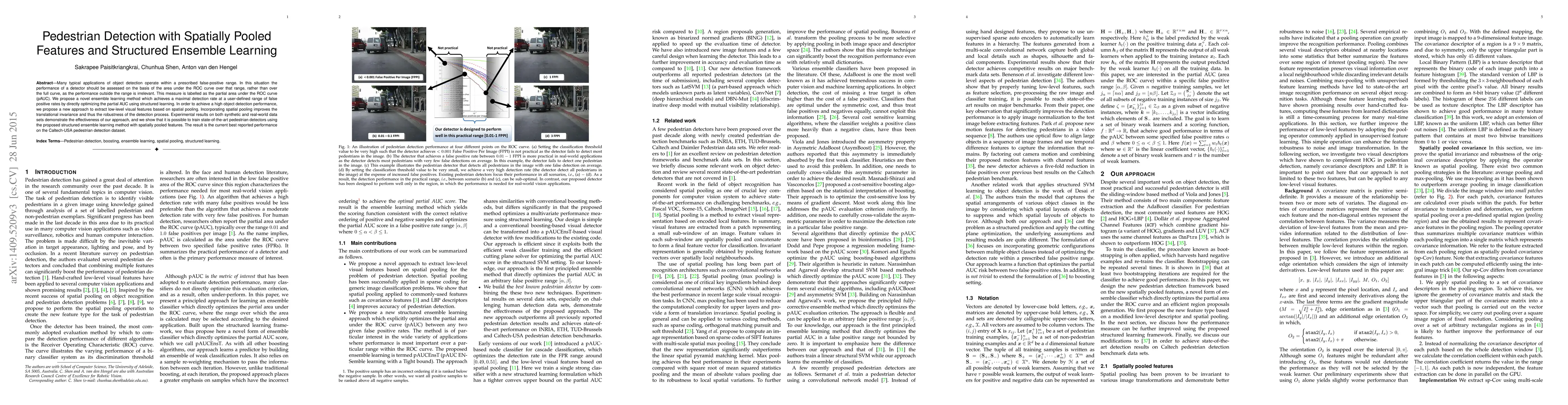 This paper proposes an ensemble learning method optimized for the partial area under the ROC curve (pAUC) to achieve maximal detection rates within a user-defined false-positive range. It introduces spatially pooled features to enhance the robustness of pedestrian detection, leading to state-of-the-art performance on the Caltech-USA pedestrian detection dataset.