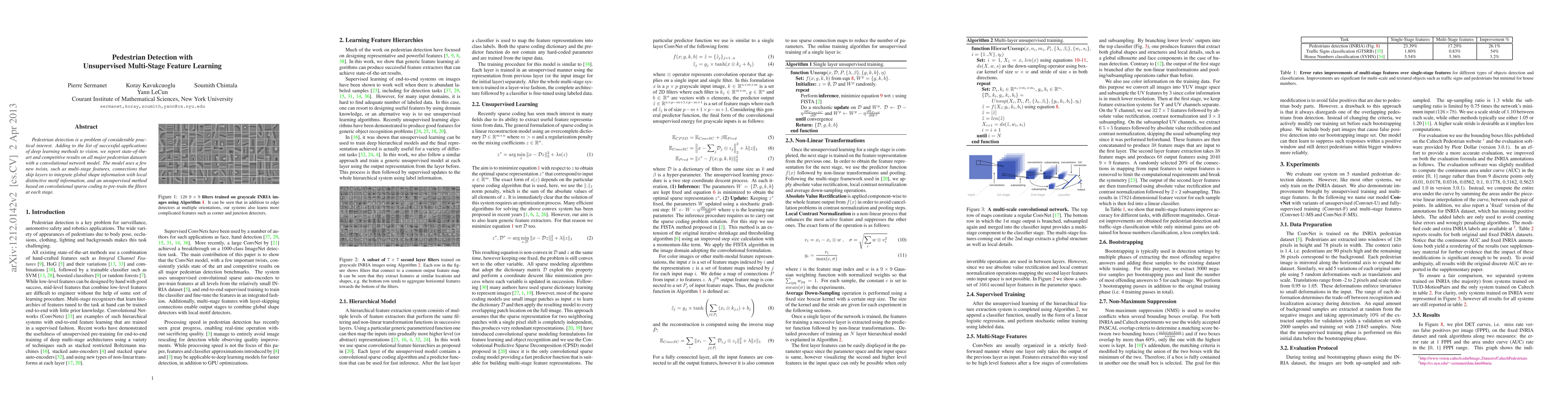 Pedestrian detection is a problem of considerable practical interest. Adding to the list of successful applications of deep learning methods to vision, we report state-of-the-art and competitive results on all major pedestrian datasets with a convolutional network model. The model uses a few new twists, such as multi-stage features, connections that skip layers to integrate global shape information with local distinctive motif information, and an unsupervised method based on convolutional sparse coding to pre-train the filters at each stage.