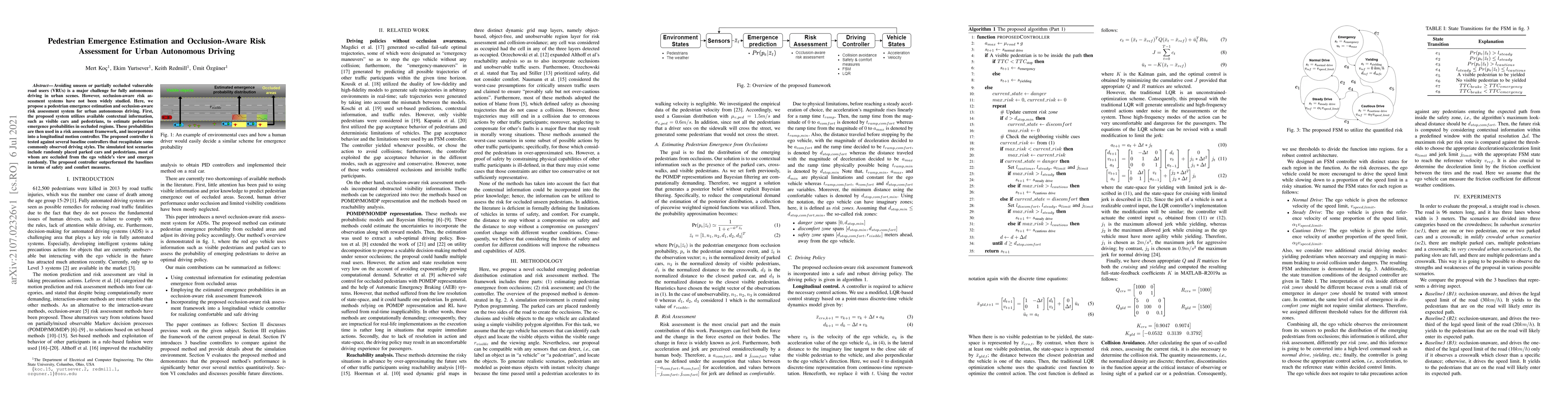 This paper proposes a pedestrian emergence estimation and occlusion-aware risk assessment system for urban autonomous driving, utilizing contextual information to predict pedestrian movements in occluded areas and integrating this into a motion controller that outperforms baselines in safety and comfort.