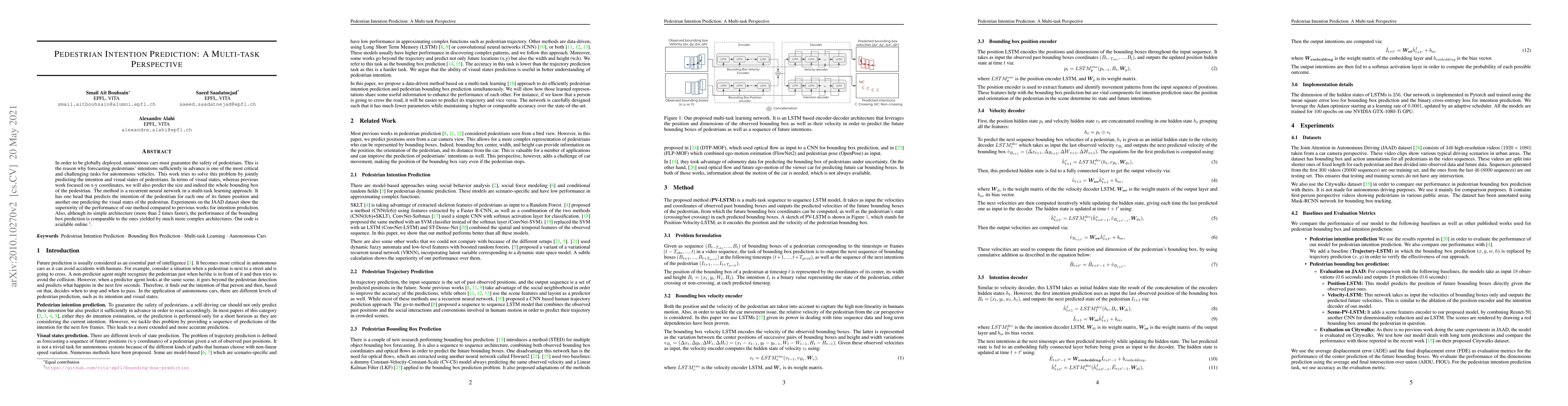 This paper proposes a multi-task learning approach using a recurrent neural network to jointly predict pedestrians' intentions and visual states, including bounding box dimensions, for safer autonomous driving. The method outperforms previous models in intention prediction and achieves comparable bounding box prediction performance with a simpler architecture.