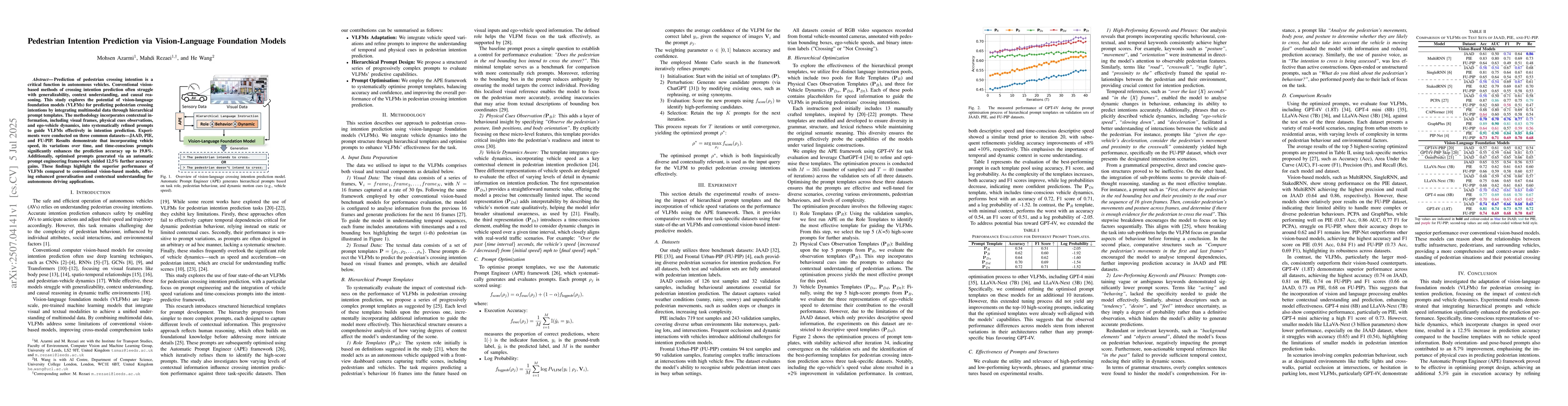 Prediction of pedestrian crossing intention is a critical function in autonomous vehicles. Conventional vision-based methods of crossing intention prediction often struggle with generalizability, context understanding, and causal reasoning. This study explores the potential of vision-language foundation models (VLFMs) for predicting pedestrian crossing intentions by integrating multimodal data through hierarchical prompt templates. The methodology incorporates contextual information, including visual frames, physical cues observations, and ego-vehicle dynamics, into systematically refined prompts to guide VLFMs effectively in intention prediction. Experiments were conducted on three common datasets-JAAD, PIE, and FU-PIP. Results demonstrate that incorporating vehicle speed, its variations over time, and time-conscious prompts significantly enhances the prediction accuracy up to 19.8%. Additionally, optimised prompts generated via an automatic prompt engineering framework yielded 12.5% further accuracy gains. These findings highlight the superior performance of VLFMs compared to conventional vision-based models, offering enhanced generalisation and contextual understanding for autonomous driving applications.