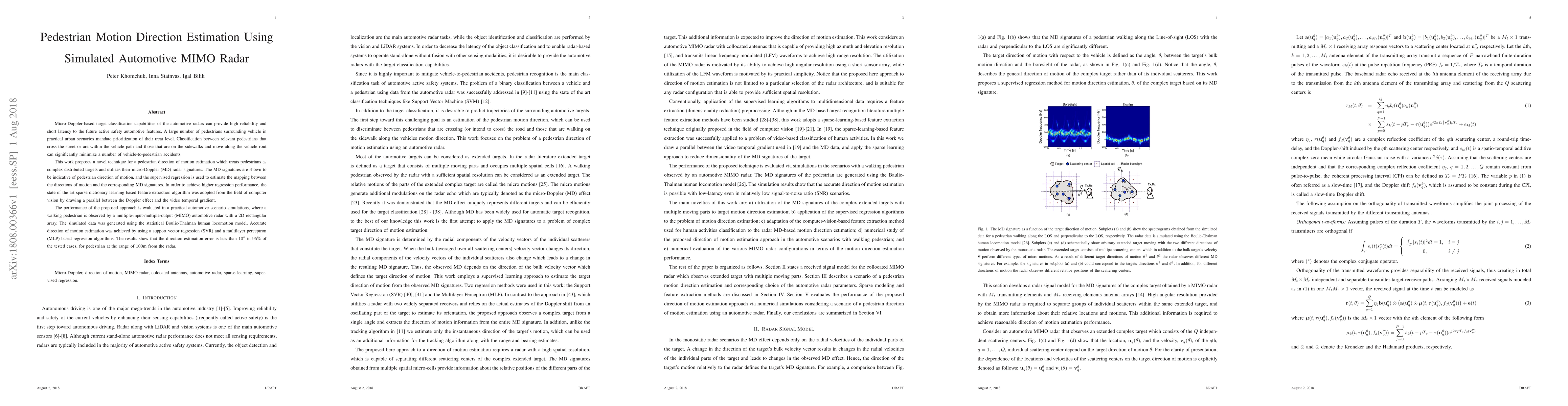 Micro-Doppler-based target classification capabilities of the automotive radars can provide high reliability and short latency to the future active safety automotive features. A large number of pedestrians surrounding vehicle in practical urban scenarios mandate prioritization of their treat level. Classification between relevant pedestrians that cross the street or are within the vehicle path and those that are on the sidewalks and move along the vehicle rout can significantly minimize a number of vehicle-to-pedestrian accidents. This work proposes a novel technique for a pedestrian direction of motion estimation which treats pedestrians as complex distributed targets and utilizes their micro-Doppler (MD) radar signatures. The MD signatures are shown to be indicative of pedestrian direction of motion, and the supervised regression is used to estimate the mapping between the directions of motion and the corresponding MD signatures. In order to achieve higher regression performance, the state of the art sparse dictionary learning based feature extraction algorithm was adopted from the field of computer vision by drawing a parallel between the Doppler effect and the video temporal gradient. The performance of the proposed approach is evaluated in a practical automotive scenario simulations, where a walking pedestrian is observed by a multiple-input-multiple-output (MIMO) automotive radar with a 2D rectangular array. The simulated data was generated using the statistical Boulic-Thalman human locomotion model. Accurate direction of motion estimation was achieved by using a support vector regression (SVR) and a multilayer perceptron (MLP) based regression algorithms. The results show that the direction estimation error is less than $10^{\circ}$ in $95\%$ of the tested cases, for pedestrian at the range of $100$m from the radar.