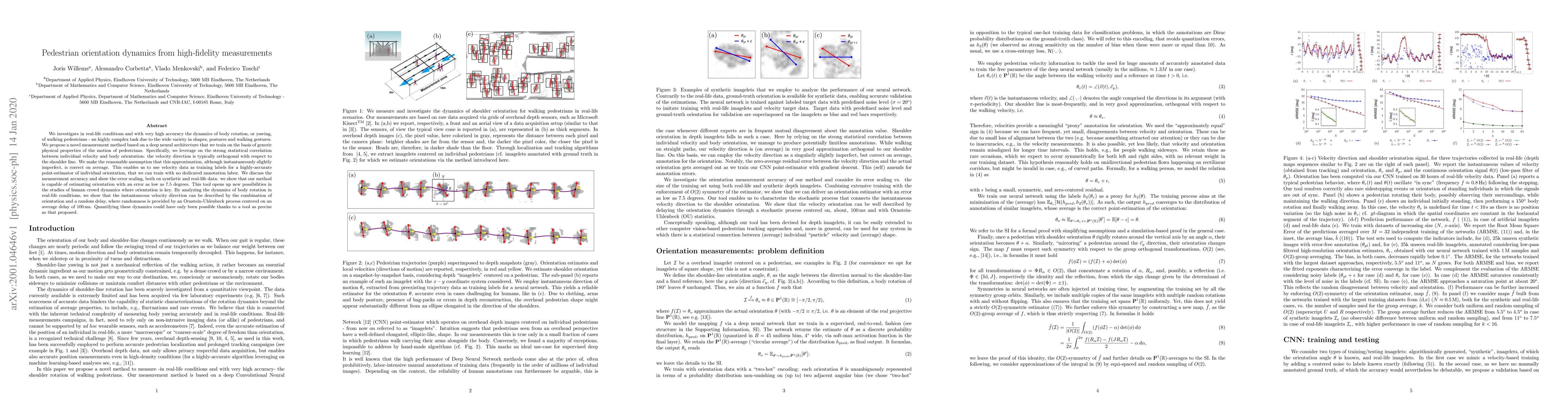 We investigate in real-life conditions and with very high accuracy the dynamics of body rotation, or yawing, of walking pedestrians - an highly complex task due to the wide variety in shapes, postures and walking gestures. We propose a novel measurement method based on a deep neural architecture that we train on the basis of generic physical properties of the motion of pedestrians. Specifically, we leverage on the strong statistical correlation between individual velocity and body orientation: the velocity direction is typically orthogonal with respect to the shoulder line. We make the reasonable assumption that this approximation, although instantaneously slightly imperfect, is correct on average. This enables us to use velocity data as training labels for a highly-accurate point-estimator of individual orientation, that we can train with no dedicated annotation labor. We discuss the measurement accuracy and show the error scaling, both on synthetic and real-life data: we show that our method is capable of estimating orientation with an error as low as 7.5 degrees. This tool opens up new possibilities in the studies of human crowd dynamics where orientation is key. By analyzing the dynamics of body rotation in real-life conditions, we show that the instantaneous velocity direction can be described by the combination of orientation and a random delay, where randomness is provided by an Ornstein-Uhlenbeck process centered on an average delay of 100ms. Quantifying these dynamics could have only been possible thanks to a tool as precise as that proposed.