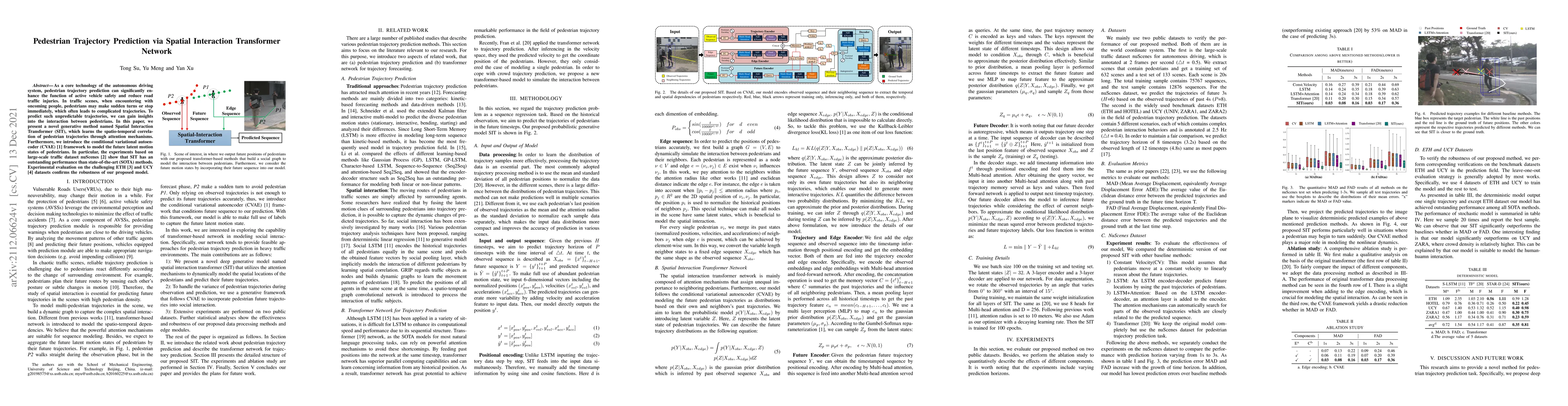 As a core technology of the autonomous driving system, pedestrian trajectory prediction can significantly enhance the function of active vehicle safety and reduce road traffic injuries. In traffic scenes, when encountering with oncoming people, pedestrians may make sudden turns or stop immediately, which often leads to complicated trajectories. To predict such unpredictable trajectories, we can gain insights into the interaction between pedestrians. In this paper, we present a novel generative method named Spatial Interaction Transformer (SIT), which learns the spatio-temporal correlation of pedestrian trajectories through attention mechanisms. Furthermore, we introduce the conditional variational autoencoder (CVAE) framework to model the future latent motion states of pedestrians. In particular, the experiments based on large-scale trafc dataset nuScenes [2] show that SIT has an outstanding performance than state-of-the-art (SOTA) methods. Experimental evaluation on the challenging ETH and UCY datasets conrms the robustness of our proposed model