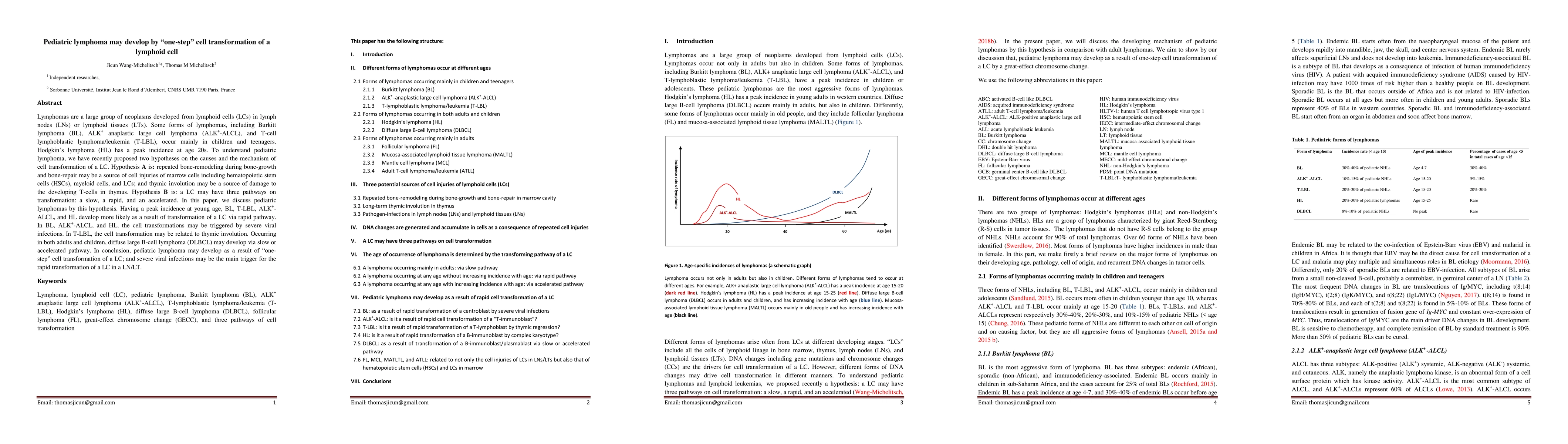 This paper explores the development of pediatric lymphomas through "one-step" transformation of lymphoid cells, suggesting that severe viral infections often trigger this rapid transformation, particularly in Burkitt lymphoma, ALK+ anaplastic large cell lymphoma, and Hodgkin's lymphoma.