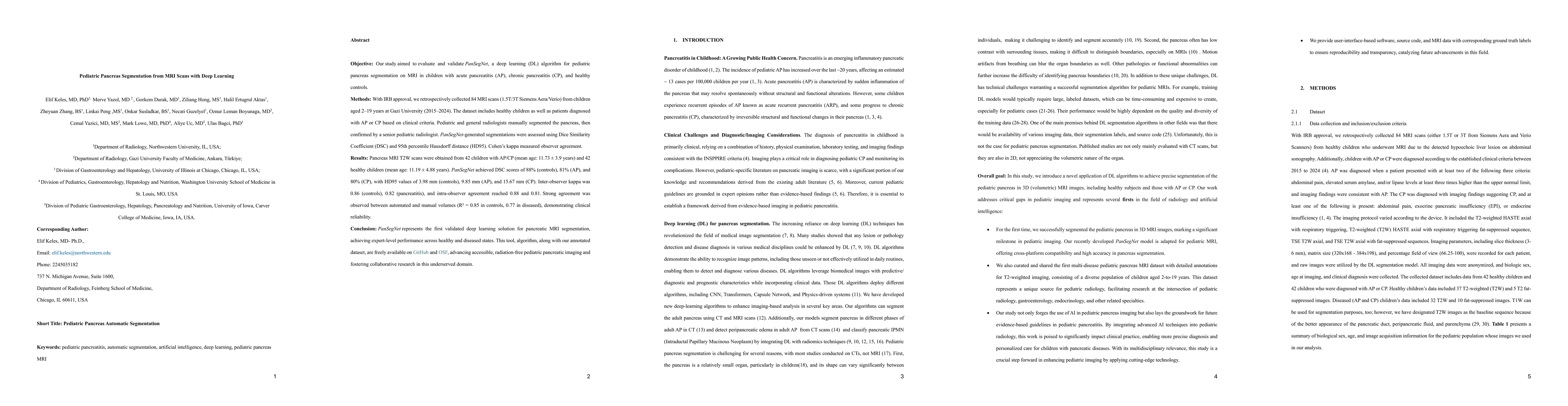 Objective: Our study aimed to evaluate and validate PanSegNet, a deep learning (DL) algorithm for pediatric pancreas segmentation on MRI in children with acute pancreatitis (AP), chronic pancreatitis (CP), and healthy controls. Methods: With IRB approval, we retrospectively collected 84 MRI scans (1.5T/3T Siemens Aera/Verio) from children aged 2-19 years at Gazi University (2015-2024). The dataset includes healthy children as well as patients diagnosed with AP or CP based on clinical criteria. Pediatric and general radiologists manually segmented the pancreas, then confirmed by a senior pediatric radiologist. PanSegNet-generated segmentations were assessed using Dice Similarity Coefficient (DSC) and 95th percentile Hausdorff distance (HD95). Cohen's kappa measured observer agreement. Results: Pancreas MRI T2W scans were obtained from 42 children with AP/CP (mean age: 11.73 +/- 3.9 years) and 42 healthy children (mean age: 11.19 +/- 4.88 years). PanSegNet achieved DSC scores of 88% (controls), 81% (AP), and 80% (CP), with HD95 values of 3.98 mm (controls), 9.85 mm (AP), and 15.67 mm (CP). Inter-observer kappa was 0.86 (controls), 0.82 (pancreatitis), and intra-observer agreement reached 0.88 and 0.81. Strong agreement was observed between automated and manual volumes (R^2 = 0.85 in controls, 0.77 in diseased), demonstrating clinical reliability. Conclusion: PanSegNet represents the first validated deep learning solution for pancreatic MRI segmentation, achieving expert-level performance across healthy and diseased states. This tool, algorithm, along with our annotated dataset, are freely available on GitHub and OSF, advancing accessible, radiation-free pediatric pancreatic imaging and fostering collaborative research in this underserved domain.