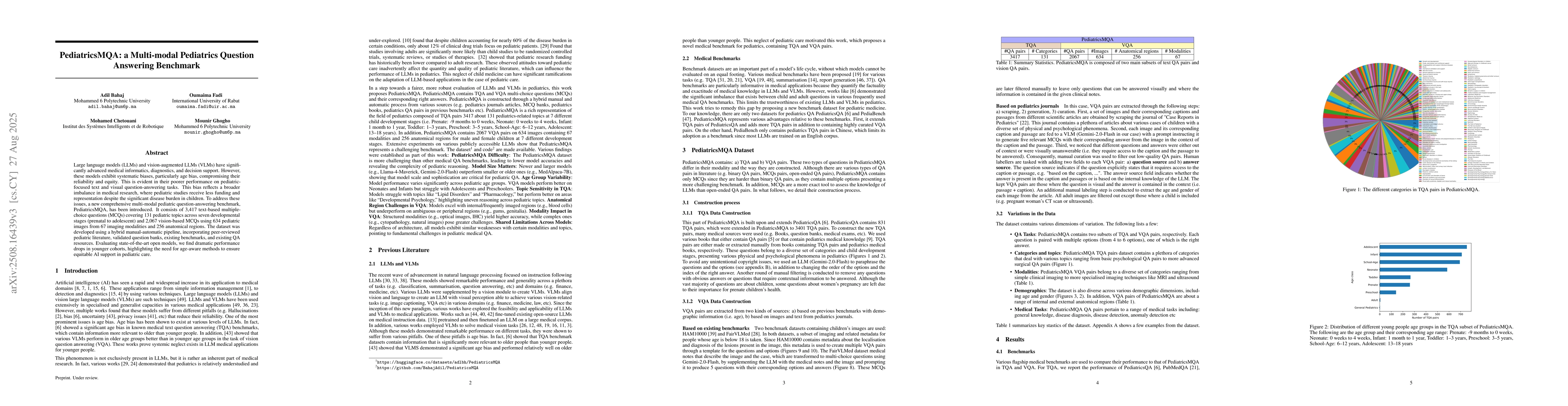 Large language models (LLMs) and vision-augmented LLMs (VLMs) have significantly advanced medical informatics, diagnostics, and decision support. However, these models exhibit systematic biases, particularly age bias, compromising their reliability and equity. This is evident in their poorer performance on pediatric-focused text and visual question-answering tasks. This bias reflects a broader imbalance in medical research, where pediatric studies receive less funding and representation despite the significant disease burden in children. To address these issues, a new comprehensive multi-modal pediatric question-answering benchmark, PediatricsMQA, has been introduced. It consists of 3,417 text-based multiple-choice questions (MCQs) covering 131 pediatric topics across seven developmental stages (prenatal to adolescent) and 2,067 vision-based MCQs using 634 pediatric images from 67 imaging modalities and 256 anatomical regions. The dataset was developed using a hybrid manual-automatic pipeline, incorporating peer-reviewed pediatric literature, validated question banks, existing benchmarks, and existing QA resources. Evaluating state-of-the-art open models, we find dramatic performance drops in younger cohorts, highlighting the need for age-aware methods to ensure equitable AI support in pediatric care.
